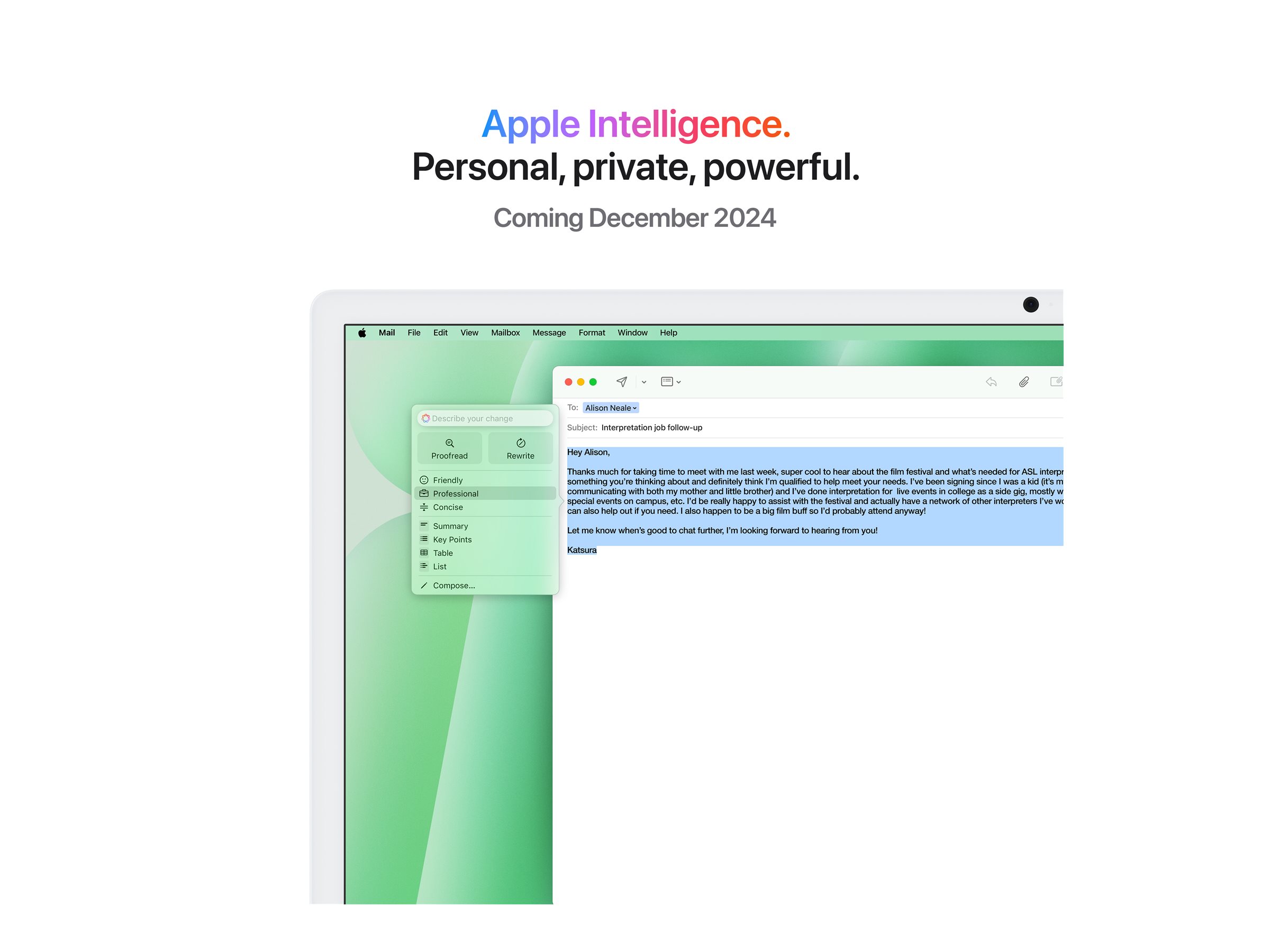 Apple Intelligence er det personlige intelligenssystem, der hjælper dig med at skrive, udtrykke dig og få tingene gjort uden besvær. Med banebrydende beskyttelse af privatlivets fred giver det dig ro i sindet, at ingen andre kan få adgang til dine data - ikke engang Apple.