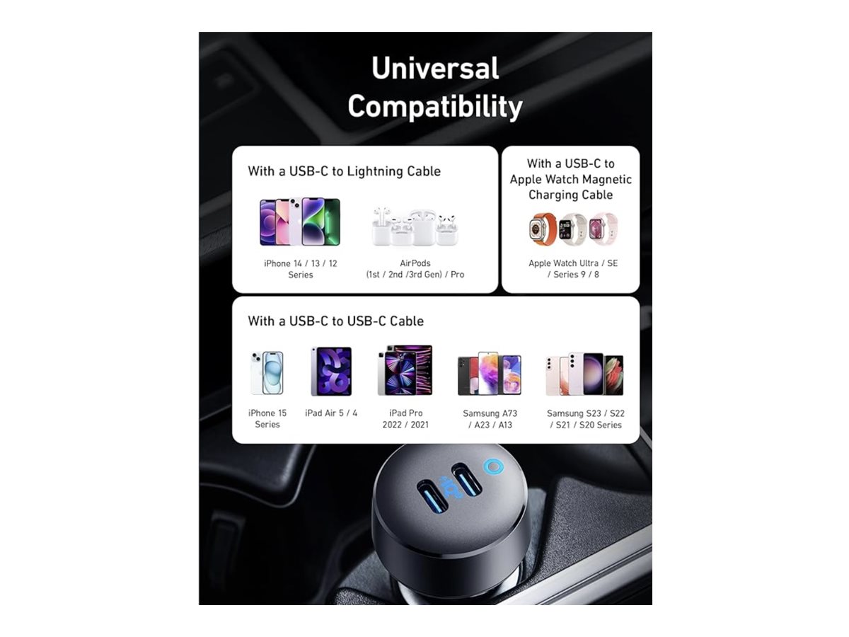 Denne biloplader er designet til en bred vifte af enheder, herunder tablets, mobiltelefoner, trådløse høretelefoner og bærbare computere, hvilket sikrer omfattende opladningsløsninger.