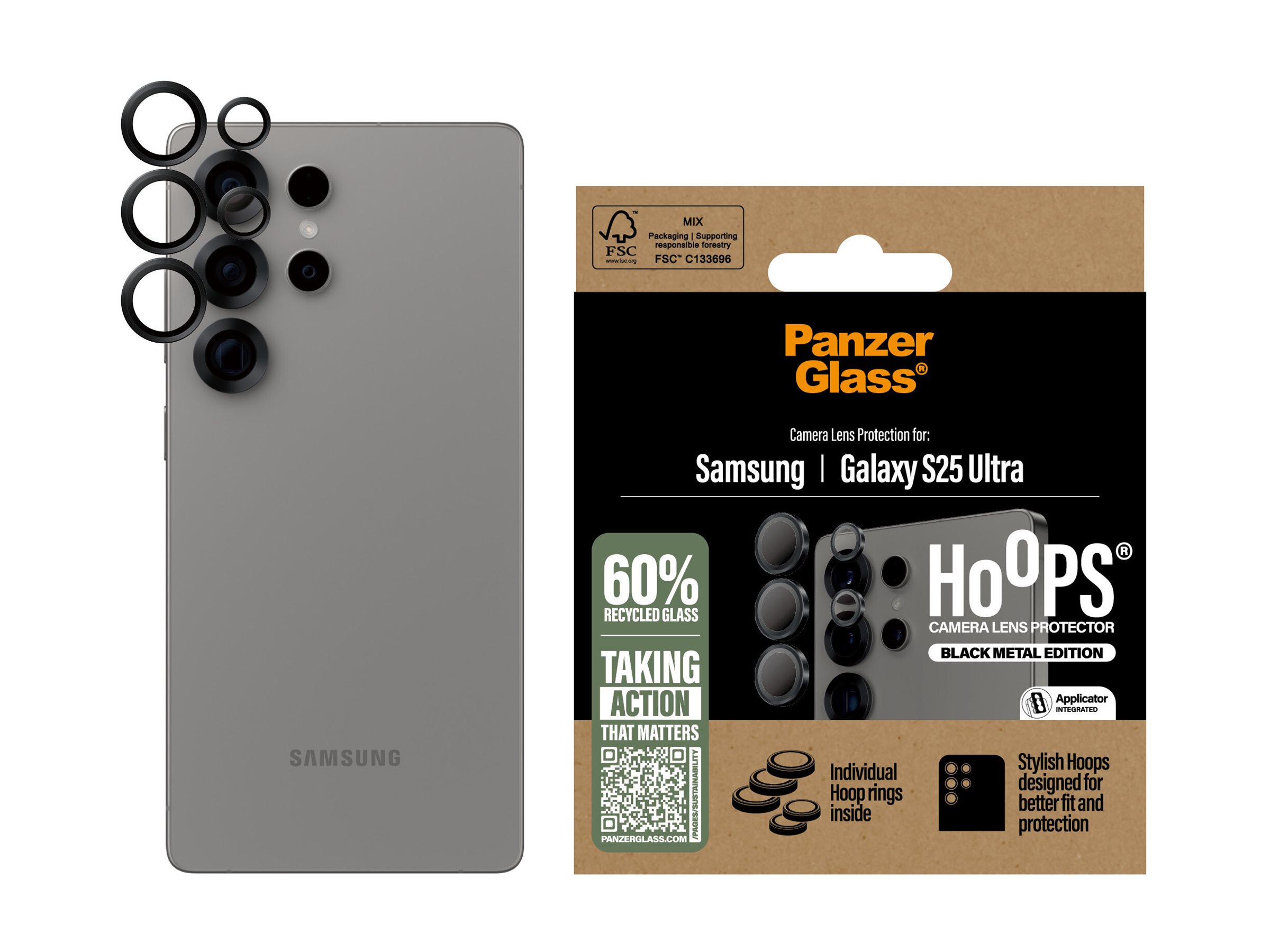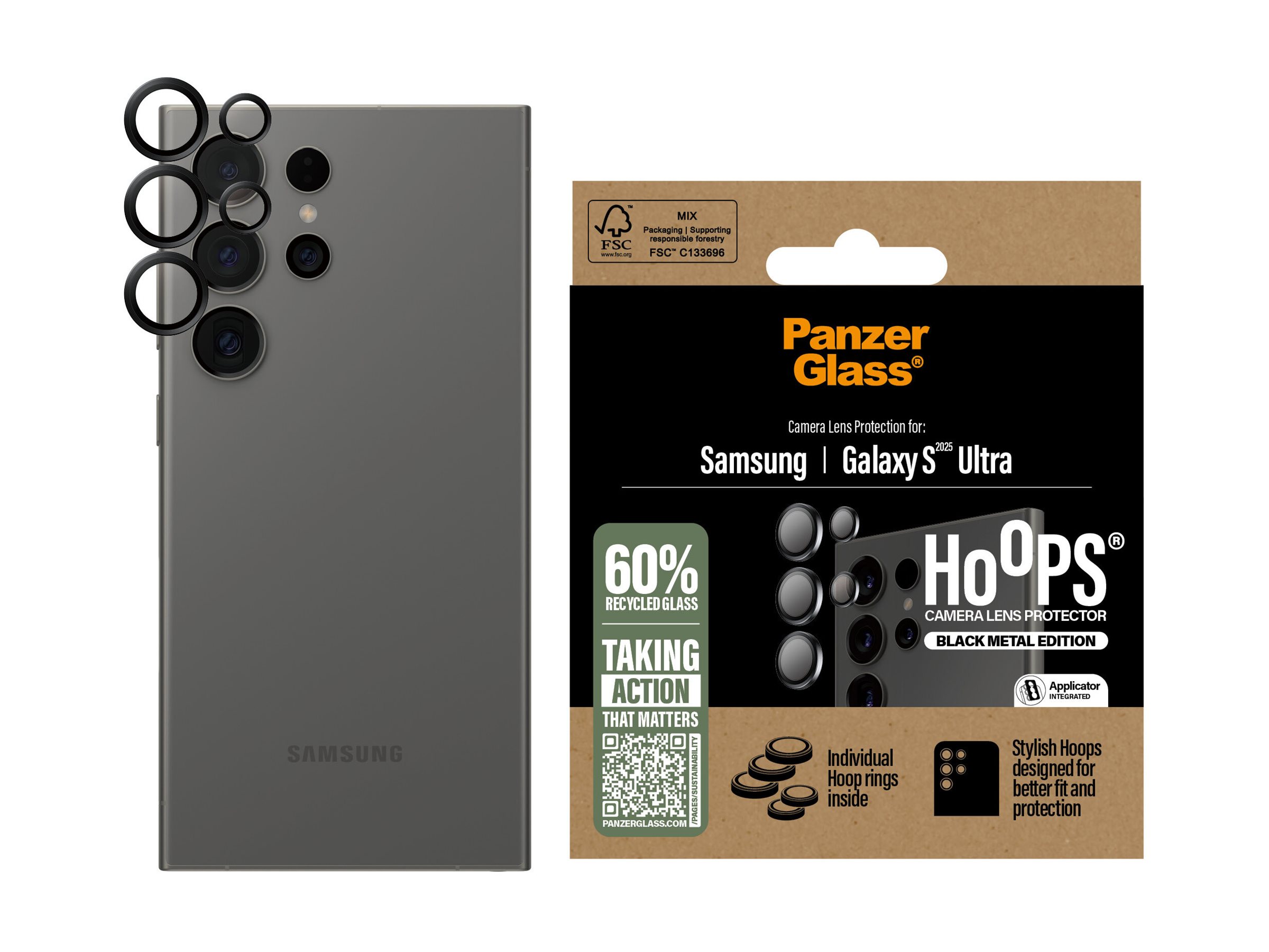 Ingen "ups!" med Hoops ! PanzerGlass Hoops beskytter dine kameralinser mod skarpe bordkanter, stenhårde fortove og andre små uheld, der kan ødelægge linserne – og dine fremtidige billeder. De tynde optiske ringe er udstyret med hærdet glas og en ramme i sort aluminium, der ikke blot holder ridser og revner på sikker afstand, men også ser elegante ud på telefonen. Og hvis du er bekymret for billedkvaliteten, kan du tage det helt roligt: Hoops påvirker hverken skarpheden, dybden eller farverne på dine billeder – de giver dig bare lidt mere ro i maven. Hoops kan forlænge levetiden på din telefon, så du en dag kan give den videre til en anden, som vil elske den lige så højt som dig. Det er ren telefonkærlighed – og én måde at bidrage til en mere bæredygtig fremtid på! En anden er at bruge mindre emballage: I 2024 reducerede vi mængden af papir i vores emballager med 66 %*, og vi leverer selvfølgelig dette produkt i en genanvendelig FSC -mærket æske. Installationen er også legende let. De stilfulde Hoops er udstyret med en selvklæbende silikonekant og leveres med et lille, handy installationsværktøj, der gør det legende let (seriøst!) at sætte de beskyttende ringe på linserne! Og husk: Når først Hoops er installeret, behøver du ikke længere frygte synet af dine kameralinser med kurs mod asfalten. Det kommer muligvis aldrig til at ske, men hvis det gør, vil du fortryde, at du ikke klikkede "Tilføj til kurv". *Gennemsnitlig reduktion fra 2022 til 2024 beregnet ved at sammenligne udvalgte PanzerGlass kerneprodukter.
