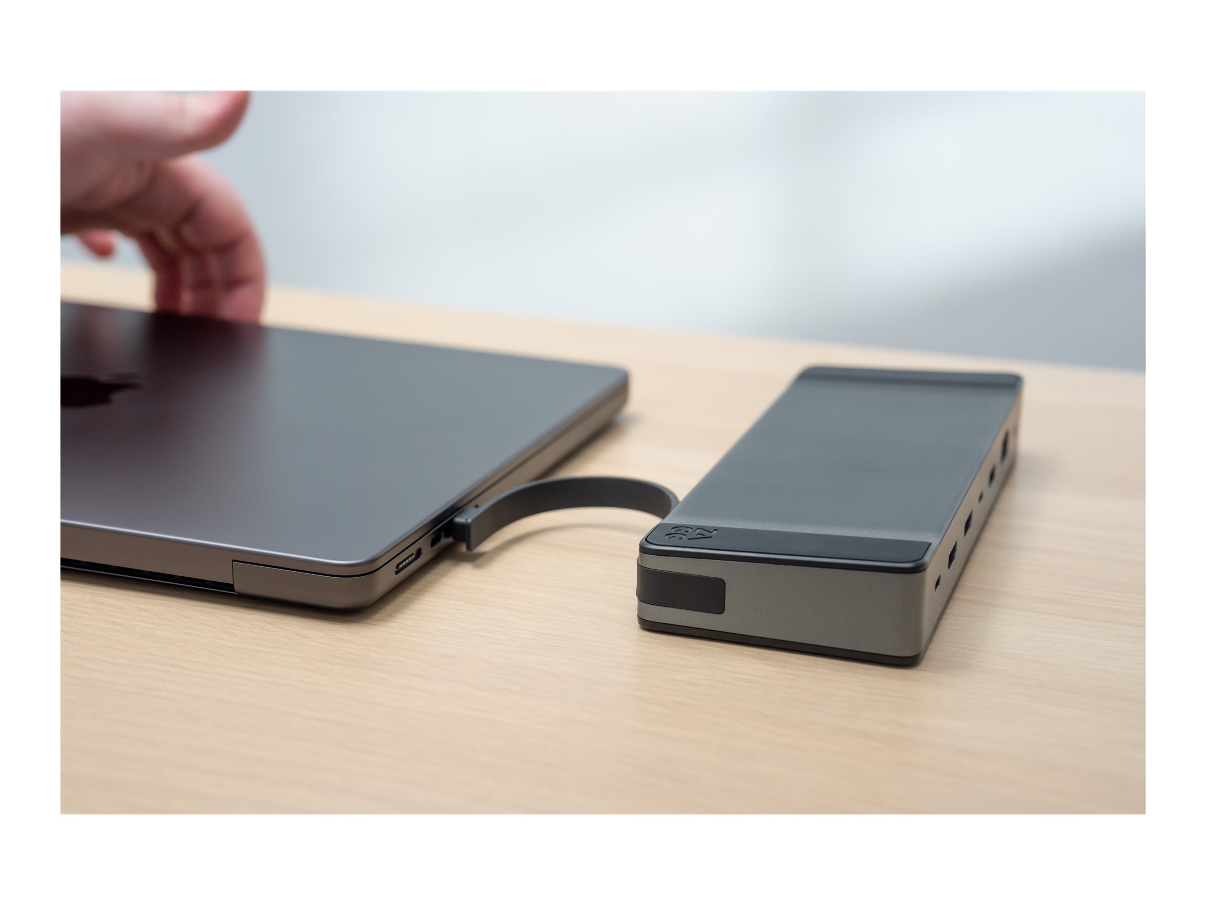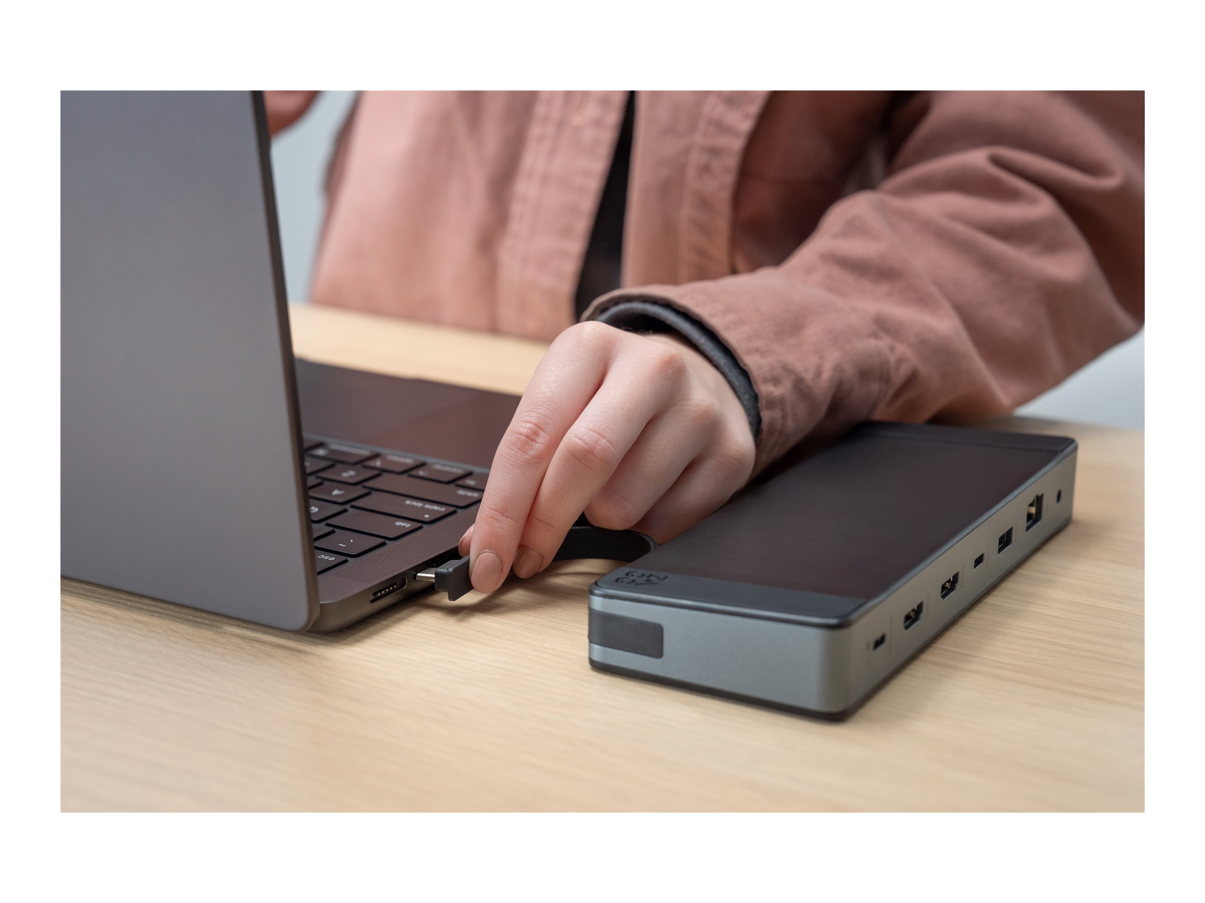 Det integrerede USB-C-kabel og det kompakte layout gør denne dockingstation til en ryddelig løsning, der holder arbejdsområdet organiseret, samtidig med at den leverer vigtig funktionalitet.