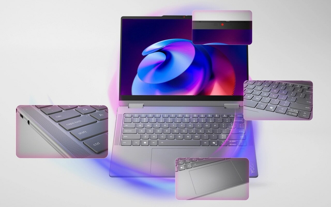 Træd ind i Premium Suite med et redesignet tastatur- tastetryk på 1,5 mm giver komfort, 0,3 mm fordybninger i tastehætter giver nøjagtighed og en holdbar Yoga-belægning. Den roterende soundbar med 4 Dolby Atmos-højttalere giver en fordybende lyd fra alle vinkler, mens støjreducerende mikrofoner holder alting klart. FHD IR-webkamera og Windows Hello sikrer, at det er hurtigt og sikkert at logge på.