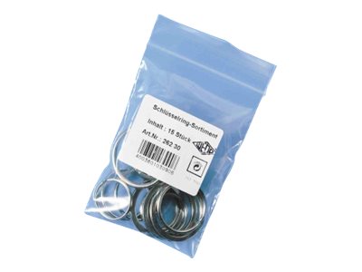 | Pakkeindhold | 3 nøgleringe (25 mm), 3 nøgleringe (30 mm), 3 nøgleringe (35 mm), 3 nøgleringe (30 mm) (bølgeform), 3 nøgleringe (35 mm) (flad form) |