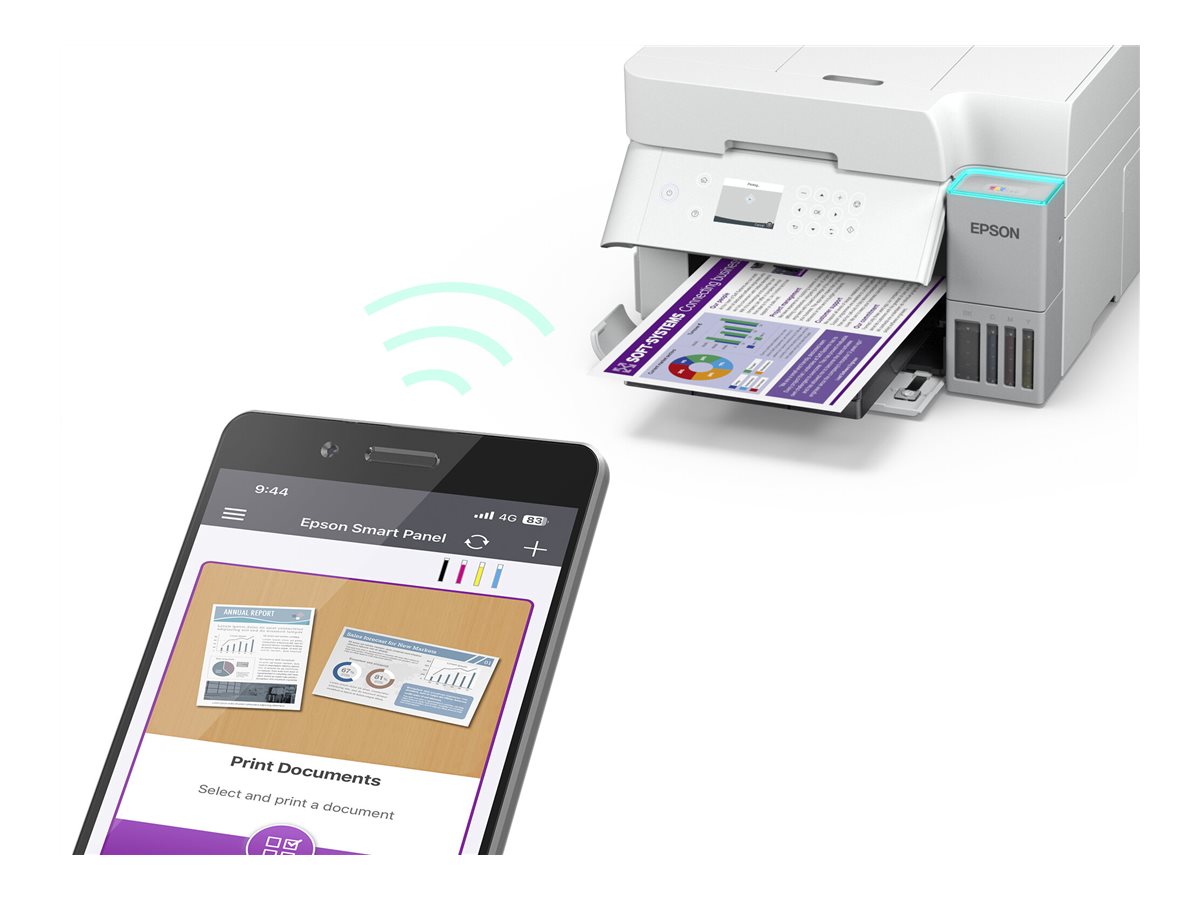 EcoTank giver problemfri udskrivning til hjemmet og kontoret. Blækbeholderne med ultrahøj kapacitet giver mulighed for genopfyldninger uden spild, og nøglelåsflaskerne er designet, så kun de korrekte farver kan isættes. Det forreste blækniveaudisplay betyder, at det er nemt at se, hvornår det endelig er tid til en genopfyldning, og det stilfulde blå lys oven på blækbeholderdækslet betyder også, at du hurtigt kan overvåge printerens status.