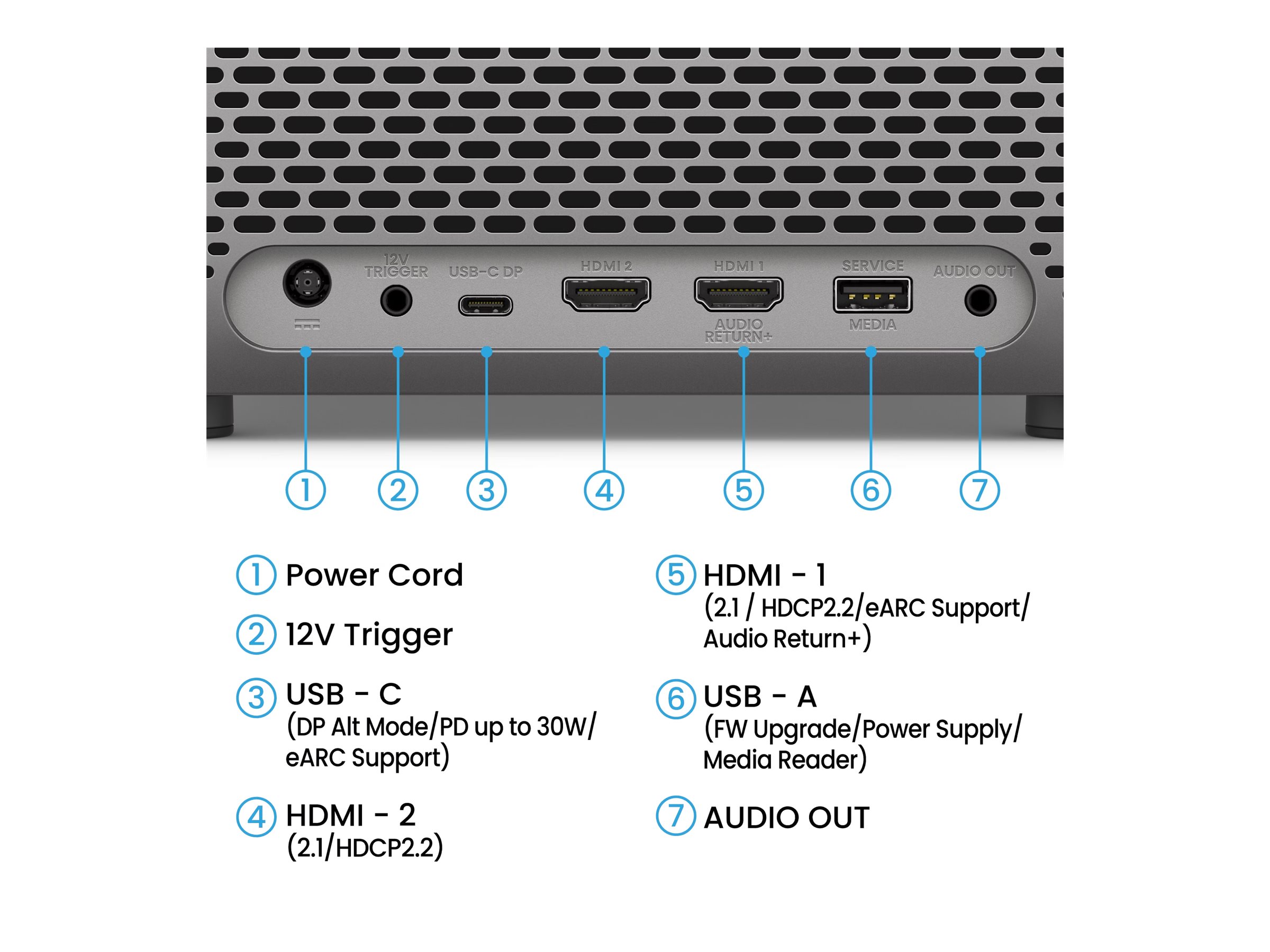 | Egenskaber | 2D keystone justering, 98 % Rec.709 dækning, Cinema Mode, HDR biograf tilstand, Bright Mode, FPS-tilstand, HDR10 kompatibilitet, HDR10+ kompatibilitet, Hybrid Log-Gamma (HLG), RPG tilstand, 5 ms input lag (1080p/60Hz), Enhanced Audio Return Channel (eARC) |