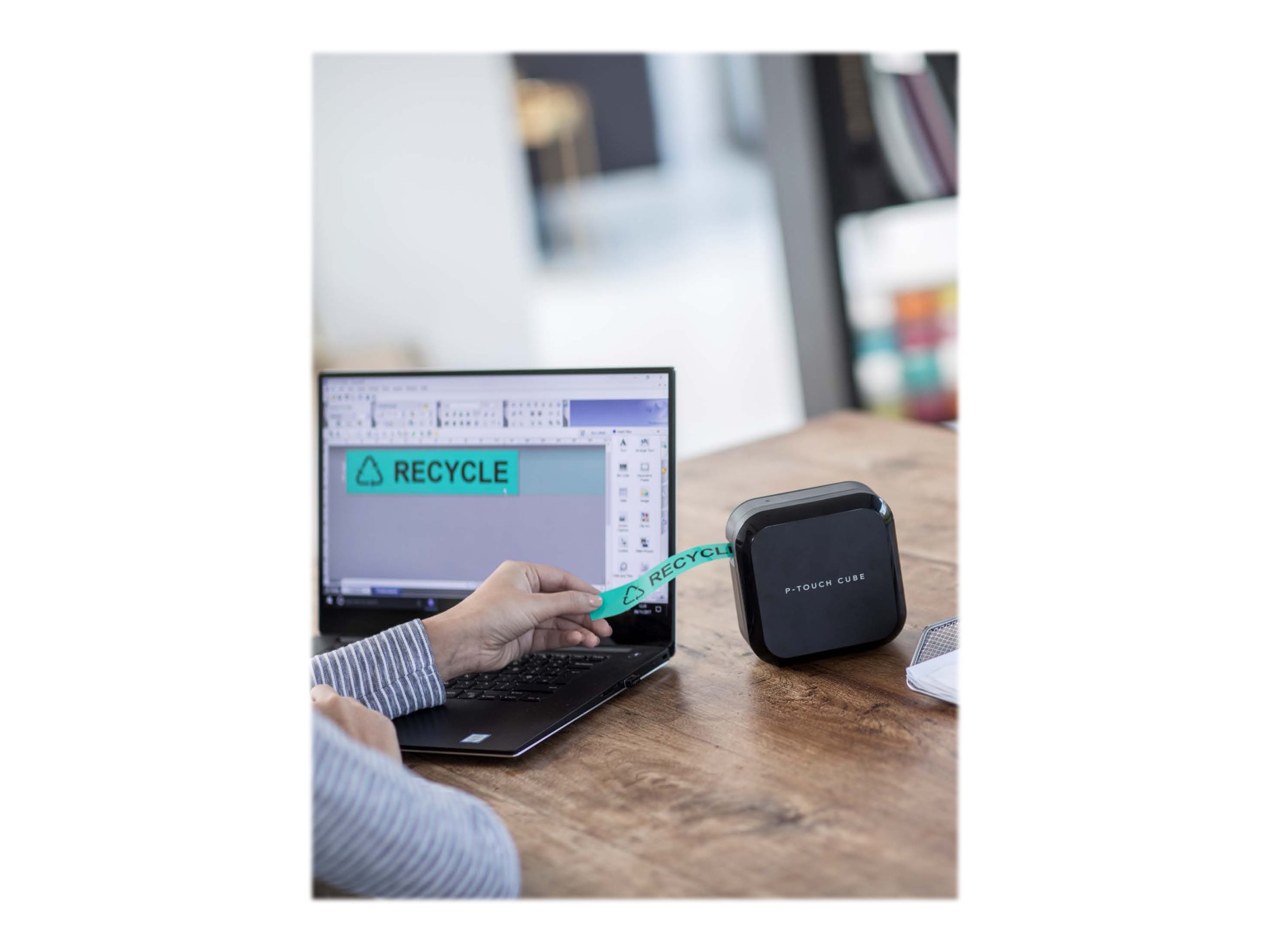 P-touch CUBE Plus er kompakt og optager ikke meget plads på skrivebordet, hvilket gør den nem at flytte og dele med kollegerne på kontoret.