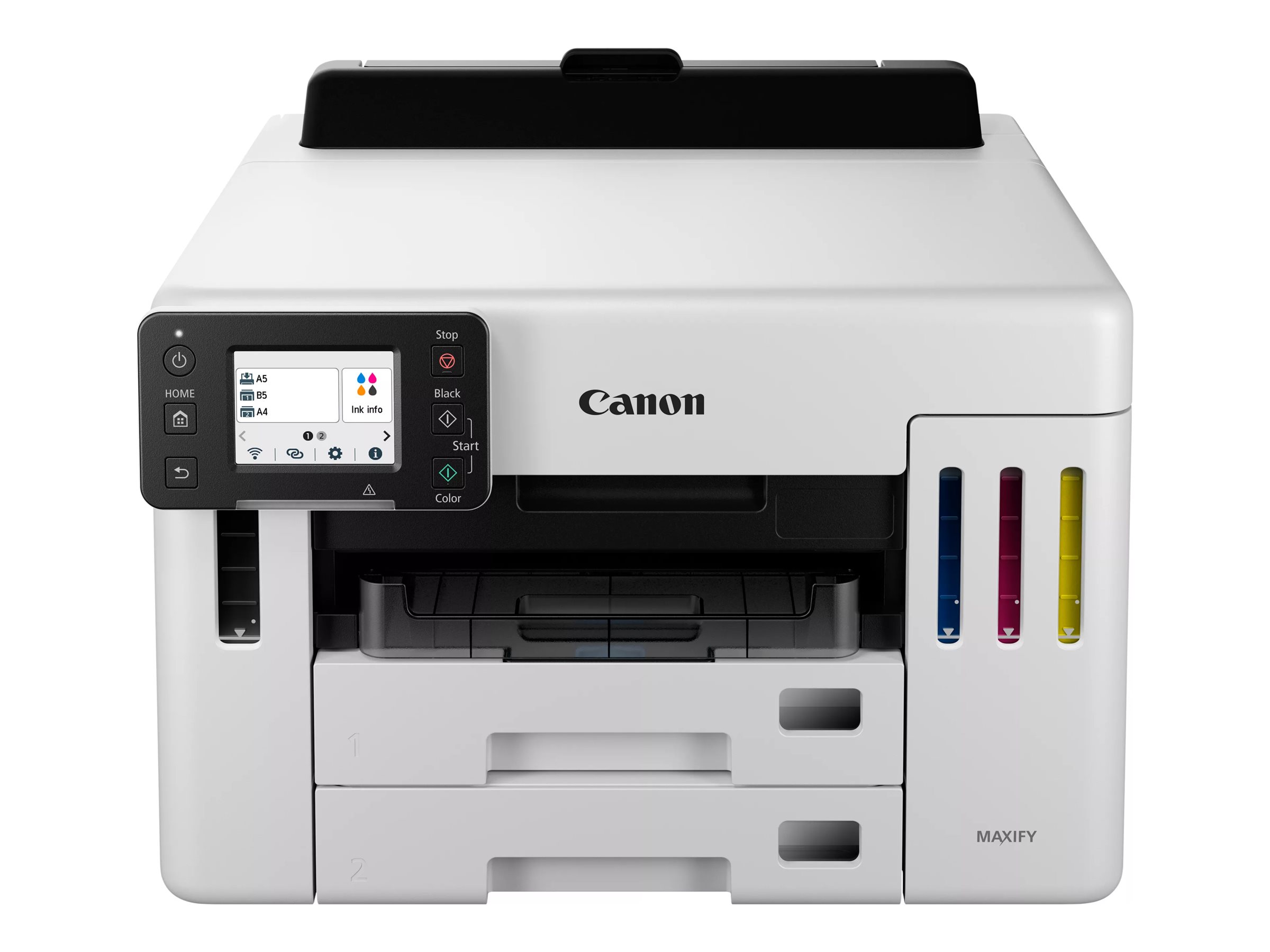 Canon MAXIFY GX5550 har en samlet mediekapacitet på 600 ark, fordelt på en 100-arks inputbakke og to 250-arks papirkassetter, og den er designet til nemt at håndtere store printjob, hvilket reducerer behovet for hyppige papirpåfyldninger.