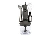 | Inkluderede klinger og påsættelser | Hånd blender fod i rustfrit stål, vedhæftning til piskeris i rustfrit stål, hakkepåsætning (0,5 l) |