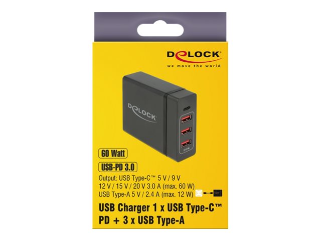 | Produktbeskrivelse | Delock USB Charger 1 x USB Type-C PD + 3 x USB Type-A 60 W - strømforsyningsadapter - 60 Watt |