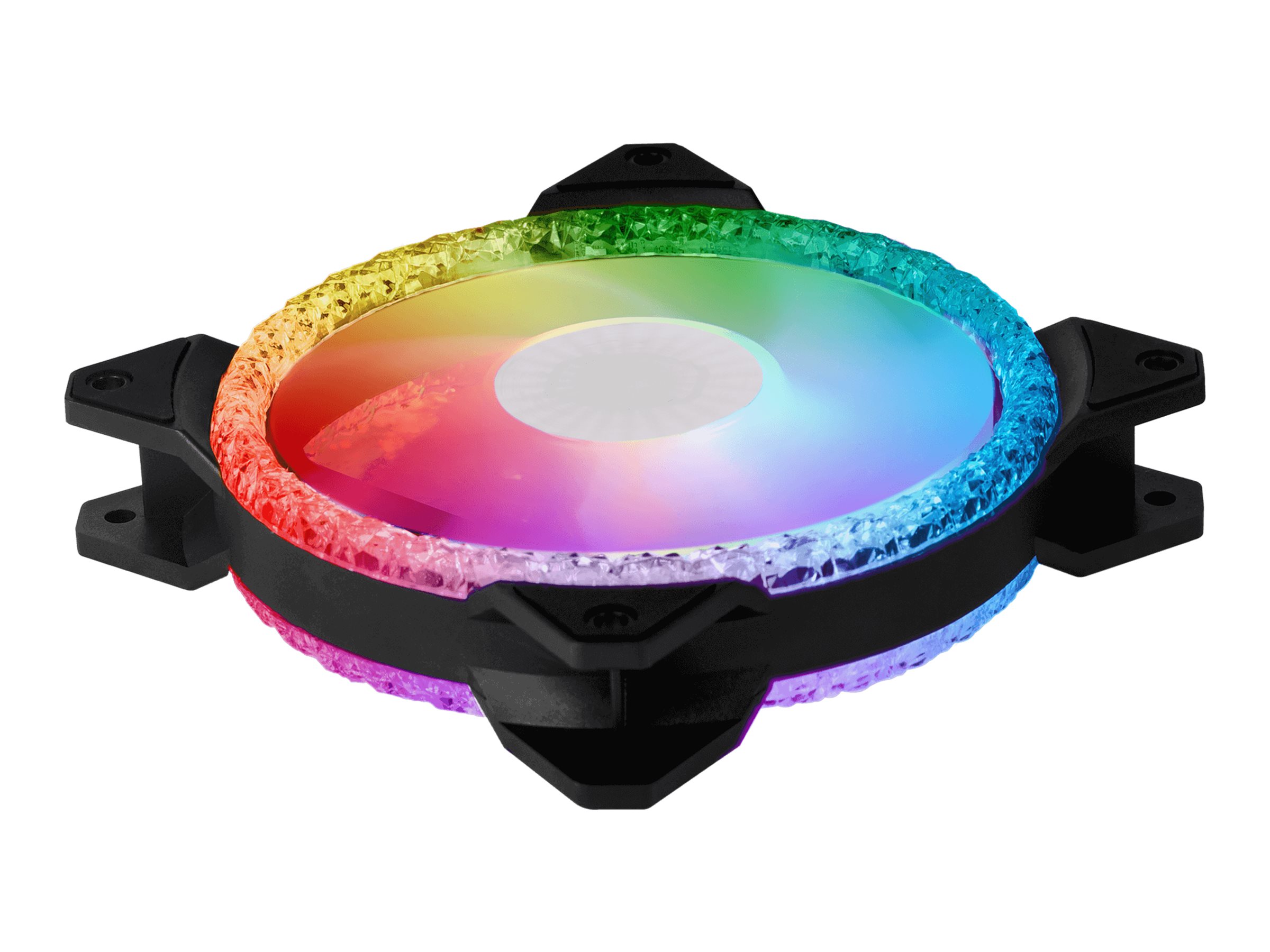 Unikt krystalliseret loop-design på begge sider af blæseren giver maksimal lysspredning af den adresserbare RGB.