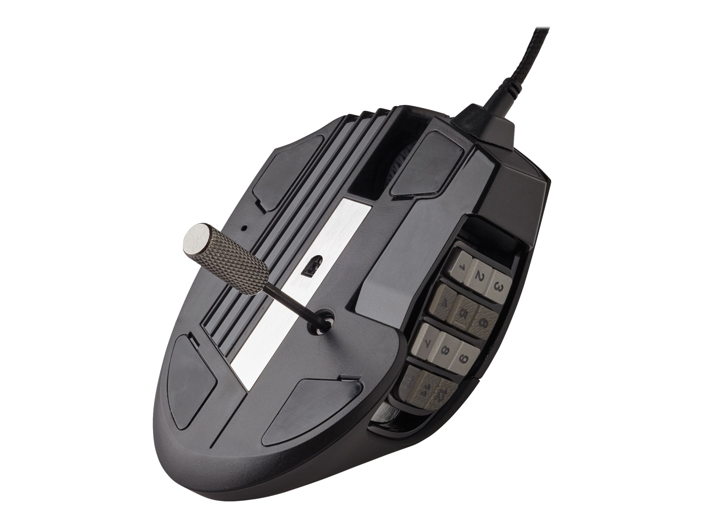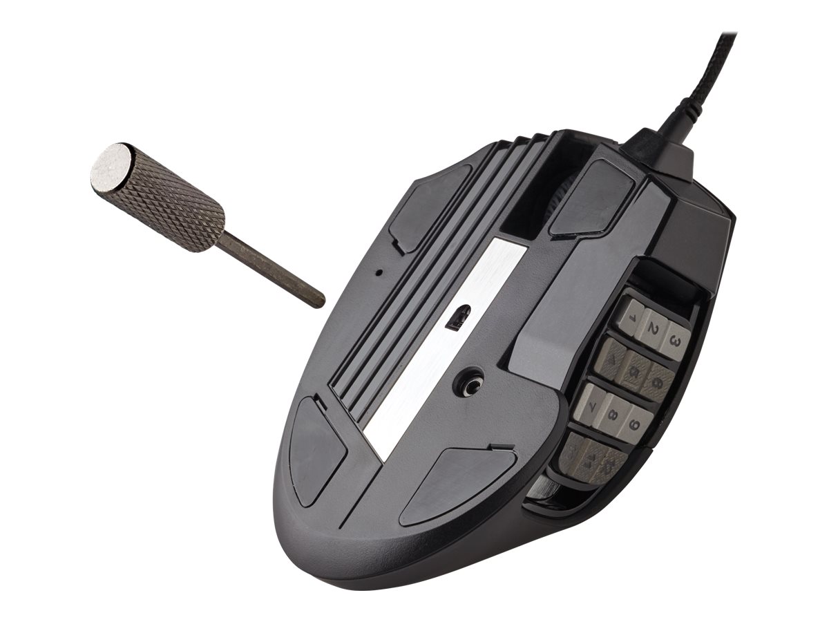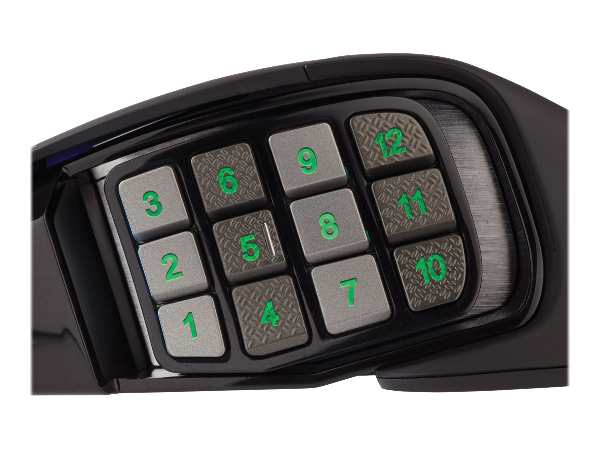 | Egenskaber | Programmerbare knapper, polytetrafluoroethylene (PTFE) feet, indbygget flash hukommelse, flettet kabel, 4-zoners belysning, OMRON-kontakter, Corsair Utility Engine (CUE), 12 mekaniske sideknapper, Pixart PMW 3391 optisk spilsensor |