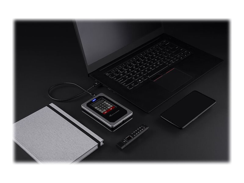 | Egenskaber | Slot sikkerhedslås (kabellås sælges separat), touch screen, validering af password, malware-beskyttelse, Brute Force Self Destruct, administratorkodeord, SilentKill, Data GeoFencing |