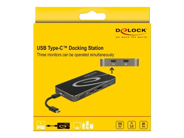 | Produktbeskrivelse | Delock USB Type-C 3.2 Dockingstation 4K - dockingstation - USB-C 3.2 Gen 1 / Thunderbolt 3 - VGA, HDMI, DP |