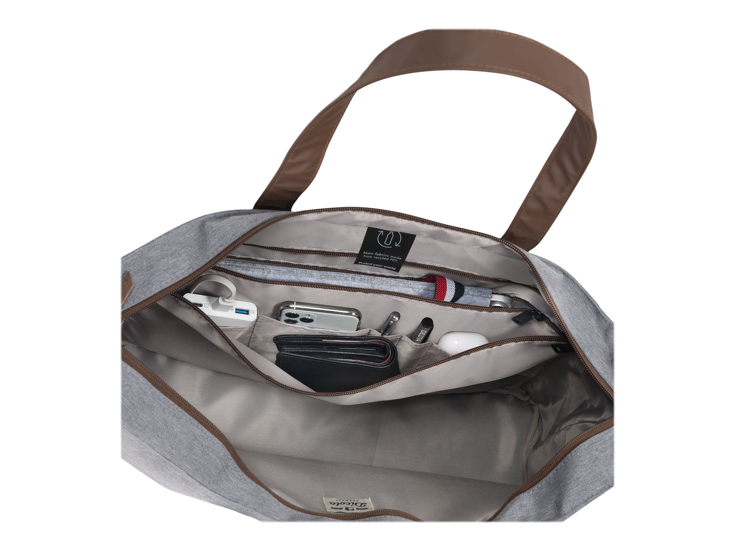 Eco slim case Motion er en let og slank taske til bærbare computere. Enheder mellem 10" og 11,6" er godt beskyttet i det polstrede notebook-rum. Stiklommen giver pålidelig beskyttelse til tablets op til 10,9". Tasken er behagelig at bære takket være det polstrede bærehåndtag og den justerbare skulderrem. Det ekstra rum på bagsiden er især praktisk til nem opbevaring af dokumenter. Din smartphone eller andre mindre ting som kabler, kuglepenne eller opladere kan opbevares i den praktiske forlomme, så de altid er lige ved hånden. Tasken er lavet af vandafvisende materiale for at beskytte indholdet selv på regnfulde dage. Eco slim case Motion er derfor perfekt til dig, der altid er på farten og gerne vil støtte genanvendelsen af PET-flasker med en miljøvenlig taske.