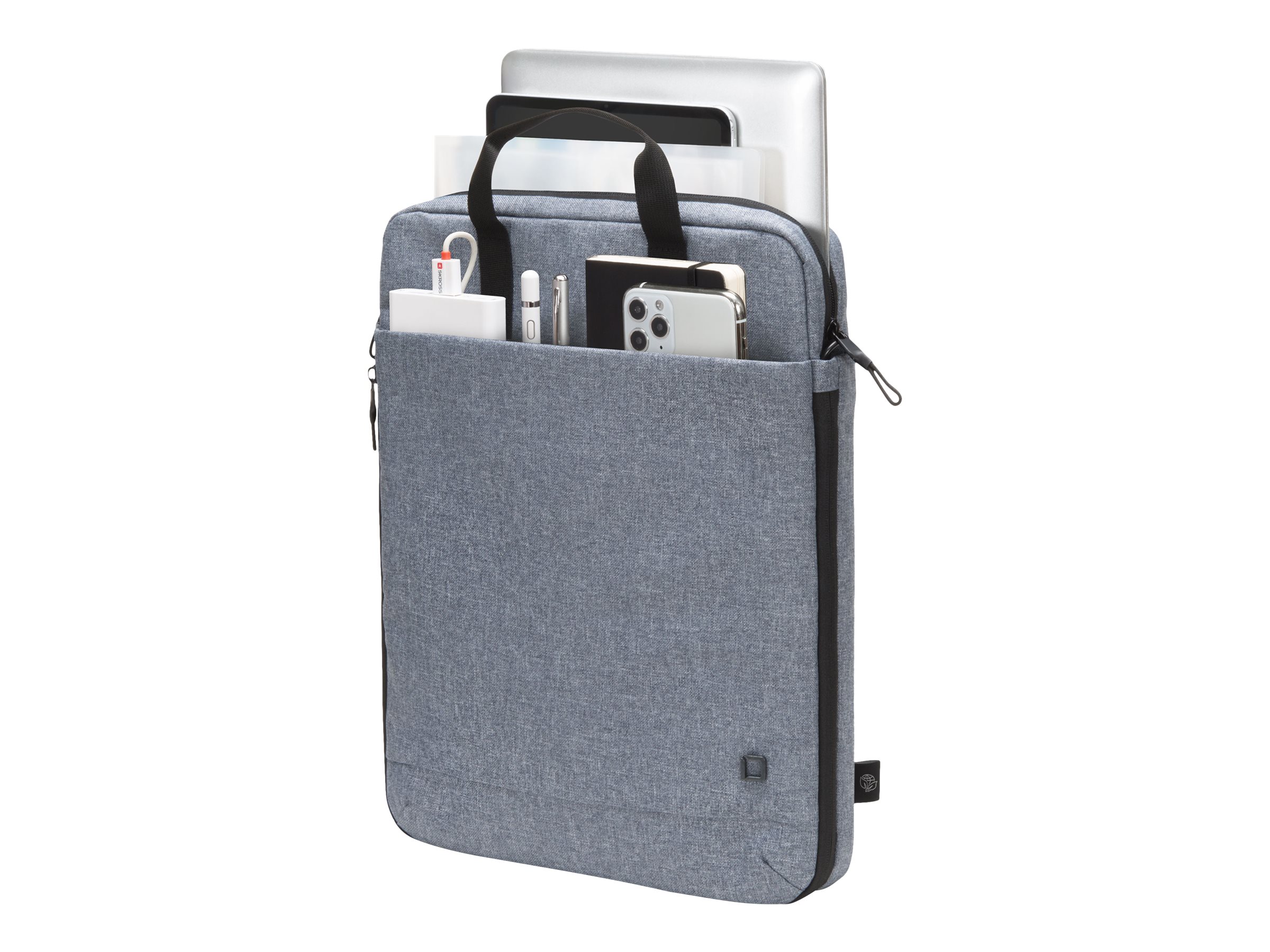 Eco Tote Bag MOTION giver ideel beskyttelse til bærbare computere mellem 13 og 15,6" takket være polstringen af HDF-skum (High Density Foam). Stiklommen giver pålidelig beskyttelse til tablets op til 12,9". Kan nemt omdannes fra skuldertaske til rygsæk med rygsækstropper, der kan gemmes væk, og en aftagelig, polstret skulderrem. Den rummelige hovedsektion er opdelt, så dokumenter og tilbehør kan opbevares separat. For at få endnu mere opbevaringsplads kan hovedrummet udvides ved hjælp af en lynlås. Forlommen har praktiske rum, så du kan organisere mindre ting som din smartphone, kuglepenne eller opladere. Tasken er lavet af vandafvisende materiale for at beskytte indholdet selv på regnfulde dage. Eco Tote Bag MOTION er derfor perfekt til dig, der altid er på farten og gerne vil støtte genanvendelsen af PET-flasker med en miljøvenlig taske.