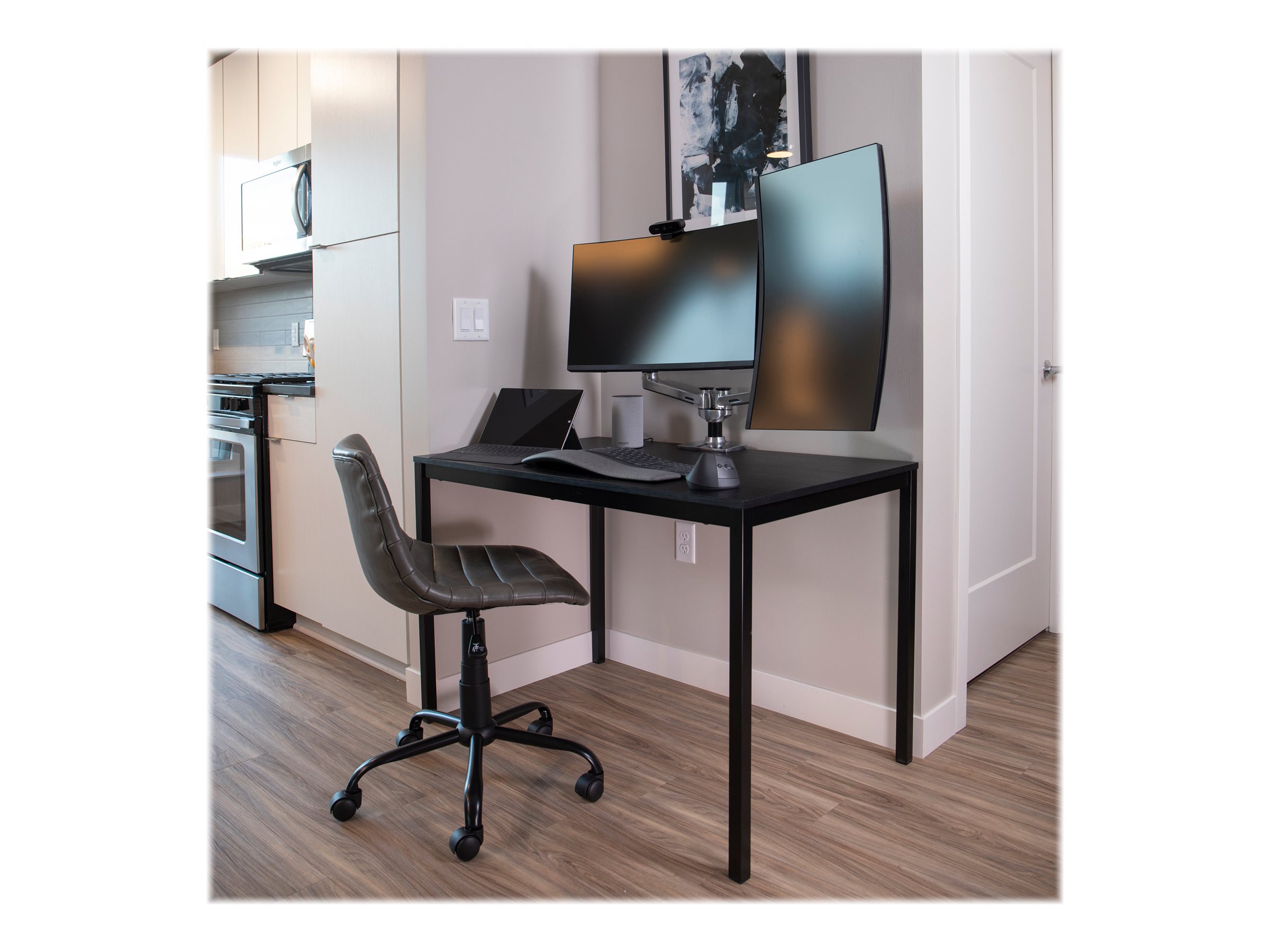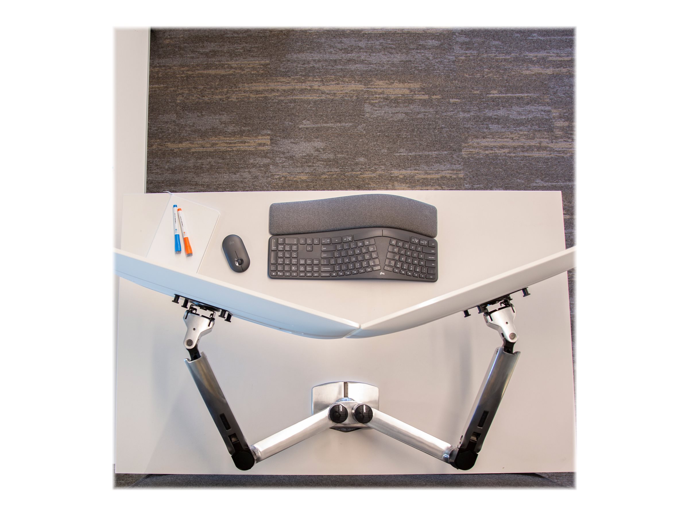 | Monteringskomponenter | Klemme til montering på skrivebord, pakning til gennemføring, stang, 2 artikulerende arme, 2 forlængelses beslag, t-bøjle, base |