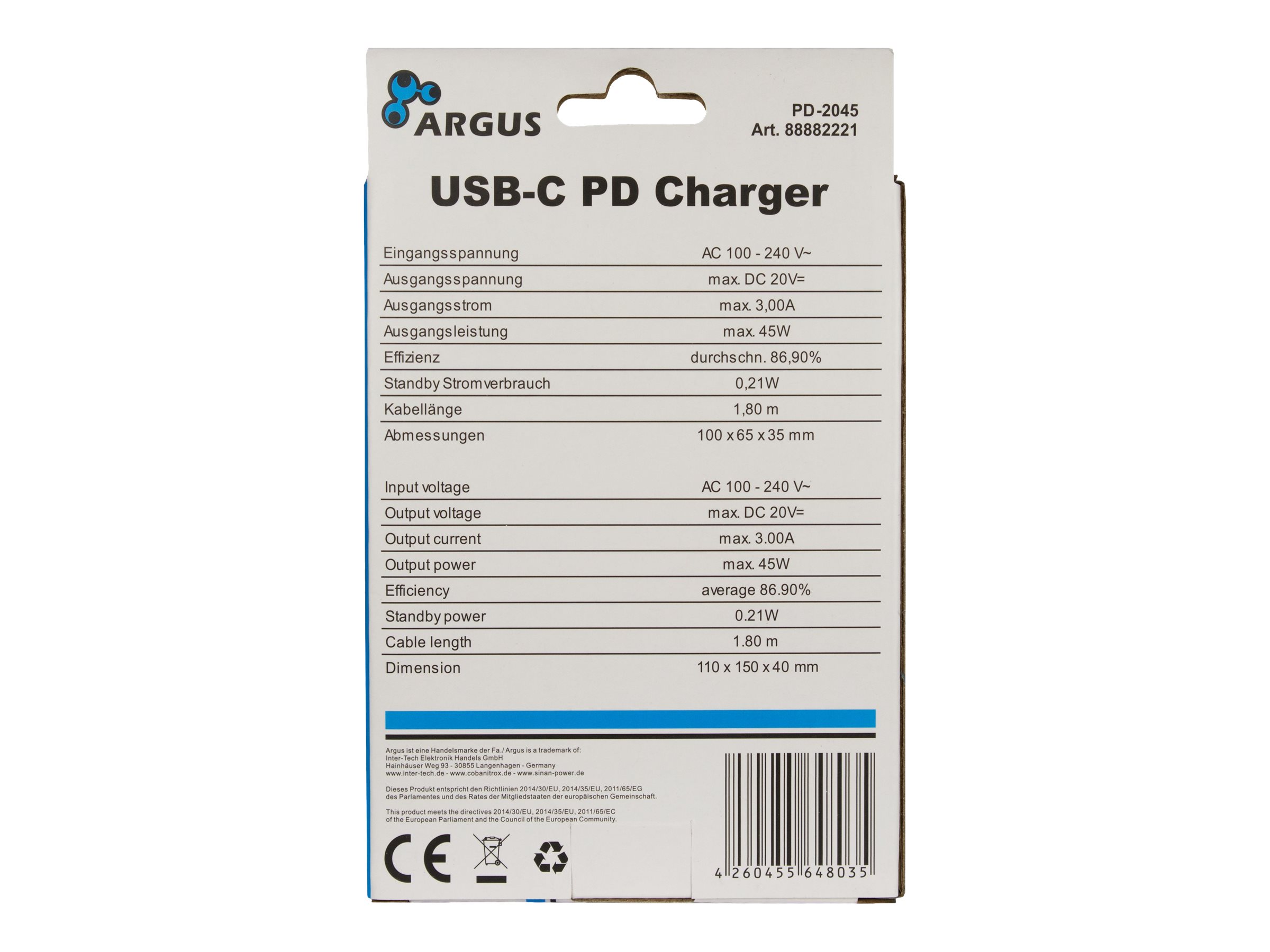 | Produktbeskrivelse | Inter-Tech PD-2045 strømforsyningsadapter - USB-C - 45 Watt |