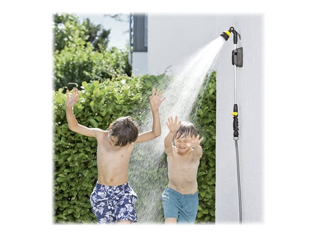 Robust metal havebruser med justerbar vinkel (180°) til vanding af f.eks. ampler eller blomsterbede. Den kan også benyttes til udendørs brusebad ved tilkøb af vægbeslag. Nem enhåndsbetjent justering og on/off funktion, 6 sprøjtefunktioner og krog til ophængning. Passer til alle klik systemer.