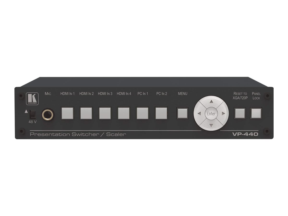 Kramer VP-440X er udstyret med en bred vifte af indgange, herunder HDMI, VGA og audio line-in, og sikrer problemfri integration med forskellige A/V-kilder. Dens omfattende interface understøtter op til fire HDMI-indgange og to VGA-indgange, hvilket gør den alsidig til enhver opsætning.
