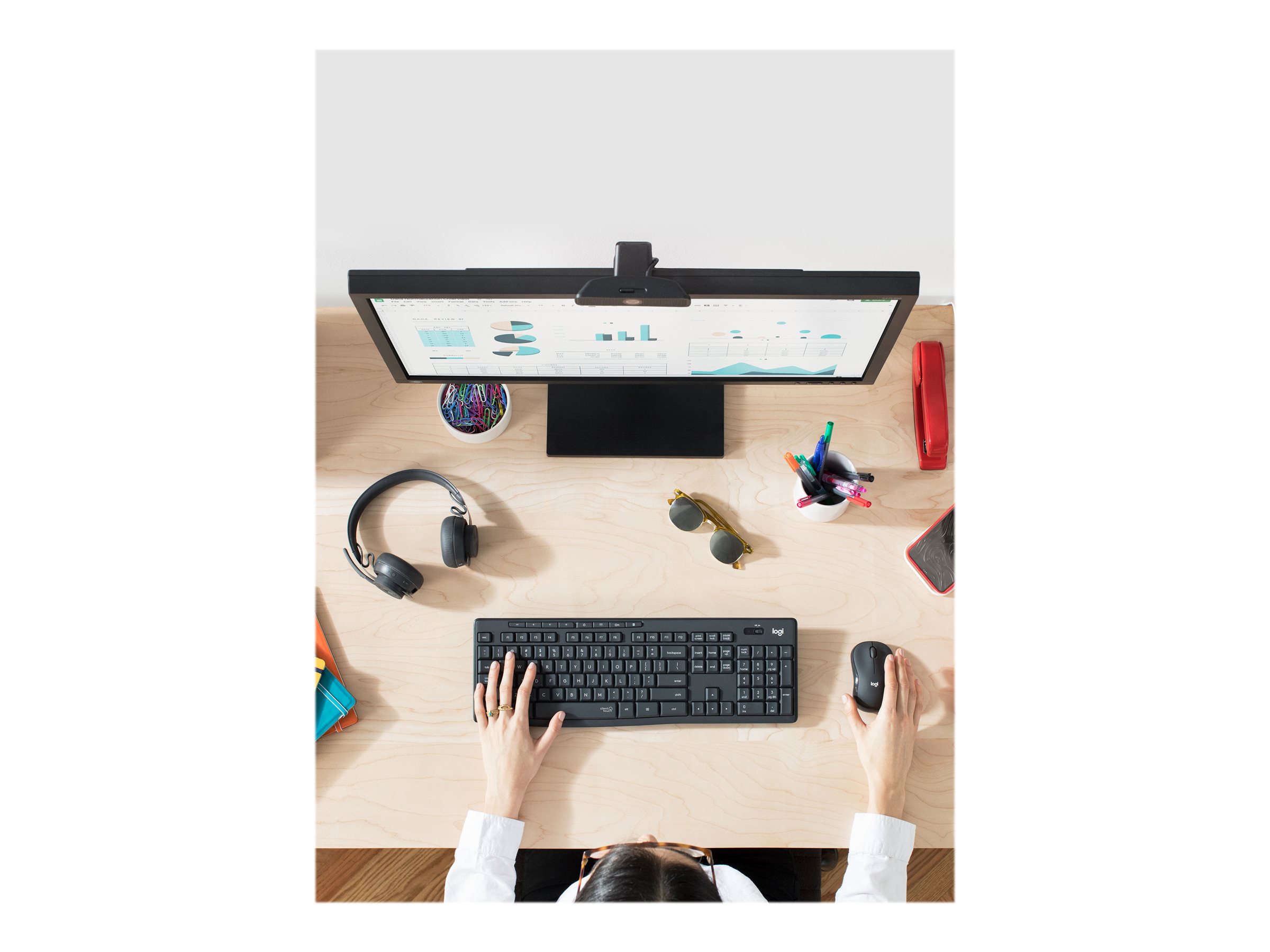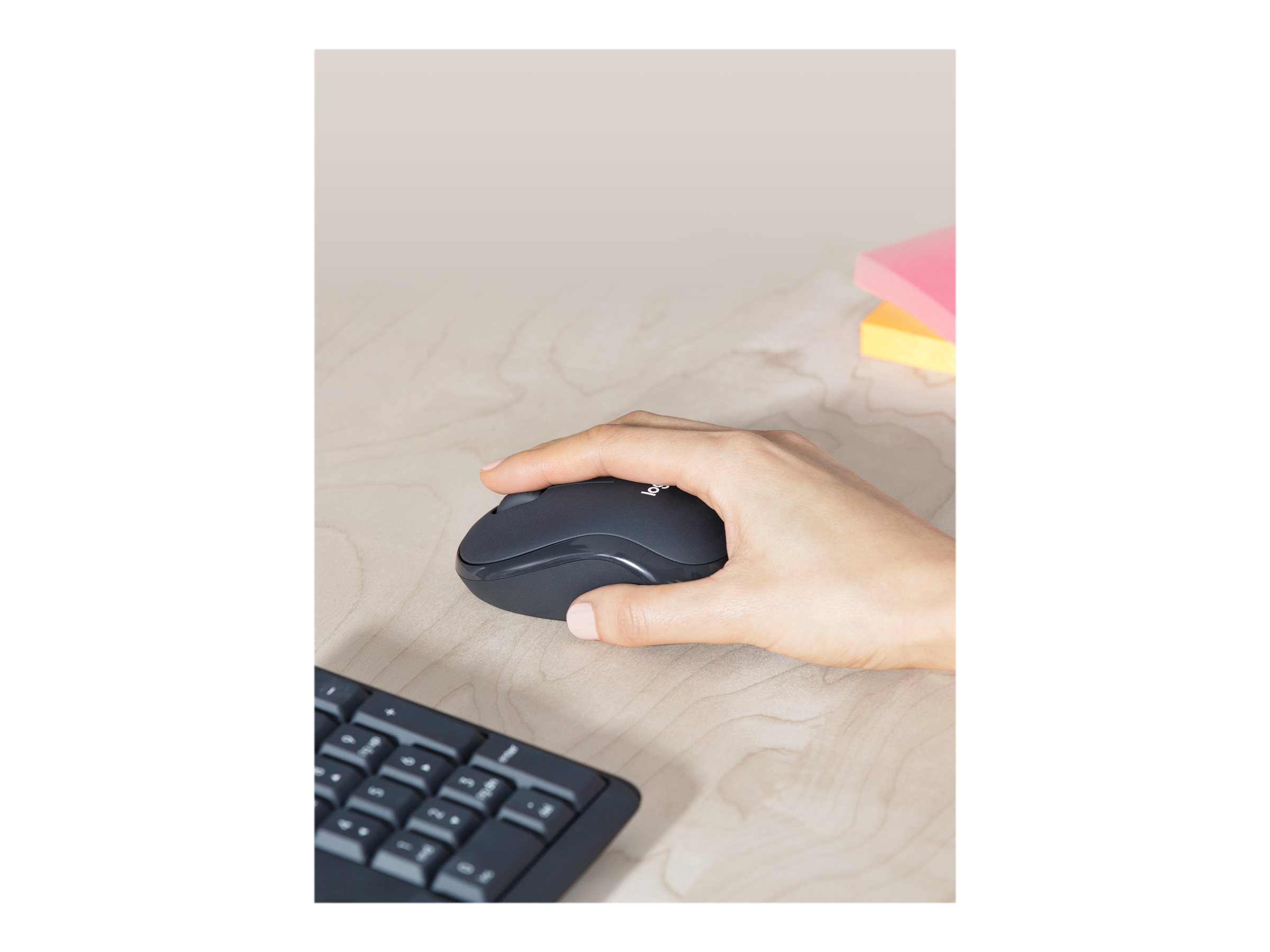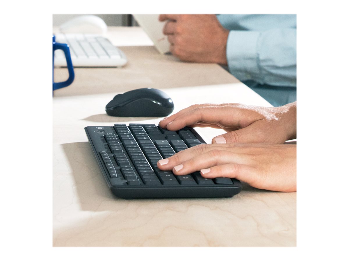 Fokuser på arbejdet, og undgå forstyrrelser. Vi præsenterer Logitech MK295 Silent Wireless Combo med SilentTouch – en unik Logitech-teknologi, som eliminerer 90 % af støjen fra tastaturet og musen. Det har samme følelse ved klik og skrivning som verdens bedst sælgende kombination – bare uden forstyrrende klikke- og skrivelyde