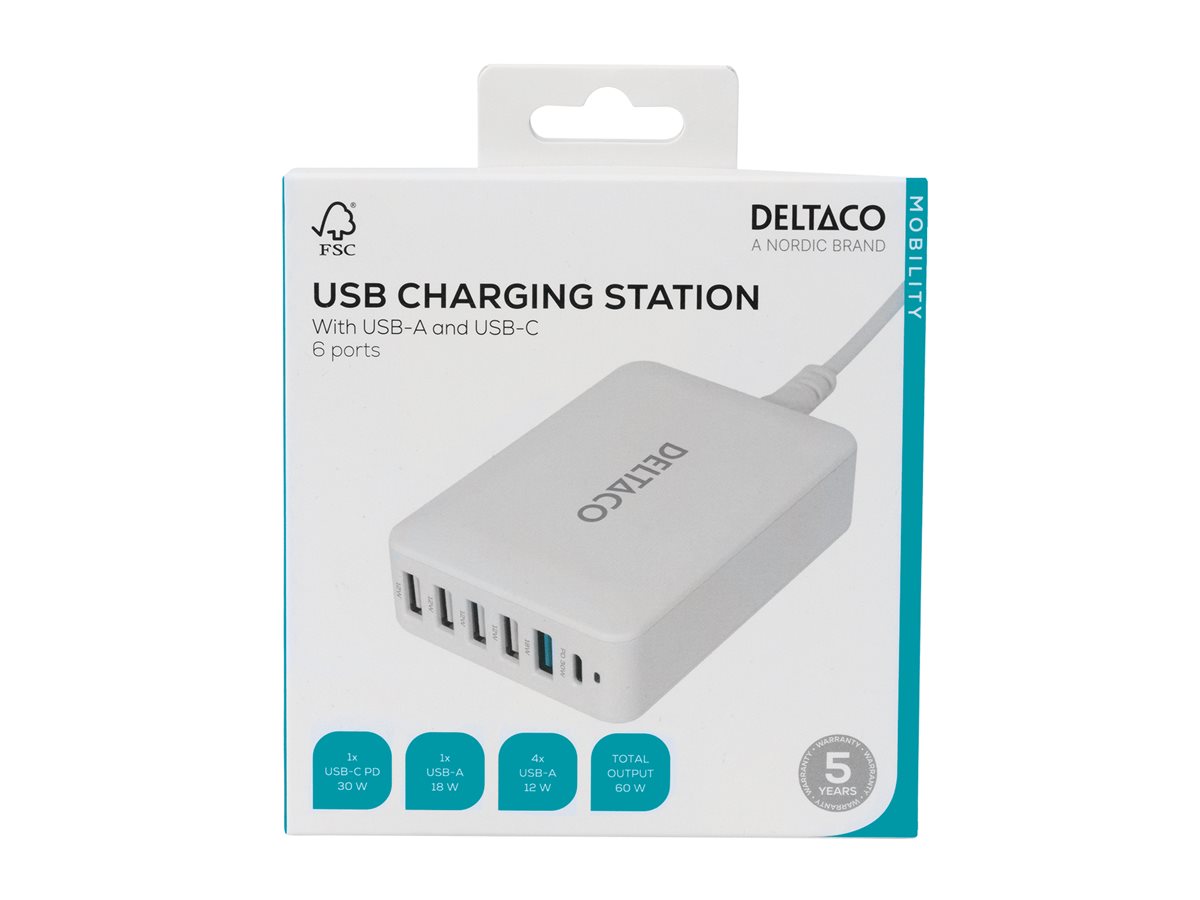 | Produktbeskrivelse | DELTACO opladningsstation - USB-C, 5 x 4 pin USB Type A - 60 Watt |