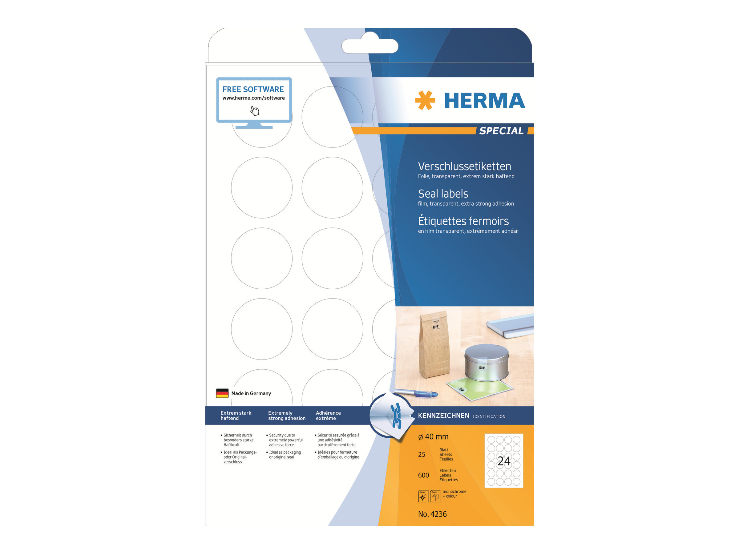 Lukkeetiketter af transparent polyesterfolie med ekstra stærk lim, på A4-ark, selvklæbende. Kan bruges til en bred vifte af anvendelser som emballage- og originallukning. Ekstremt stærkt vedhæftende, også på kritiske eller fugtige overflader. Vejrbestandig, resistent over for ældning, olie- og smudsafvisende, vaskbar. Problemfri redigering i kraft af optimal fladhed. Til laserprintere, kopimaskiner, farvelaserprintere og farvekopimaskiner. Ikke til inkjet-printere. Gratis software-løsninger: www.herma.com/software.