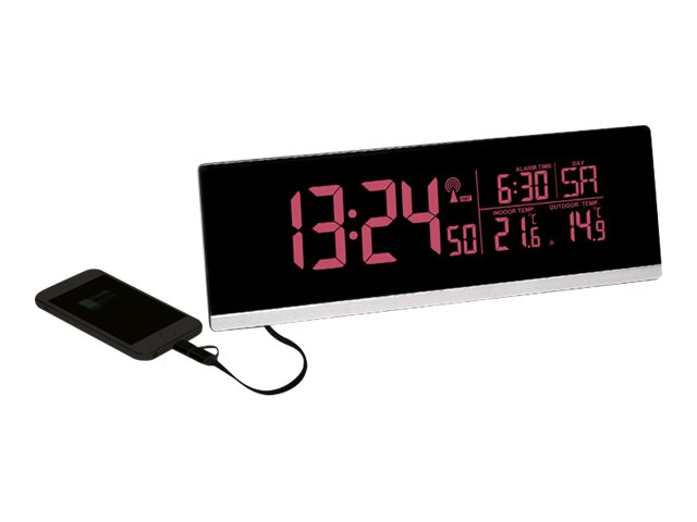 | Funktioner | Ugedagsdisplay, trådløs udendørs sensor, 2 lysstyrkeniveauer, USB-opladningsport, udskiftelige bagbelysningsfarver |