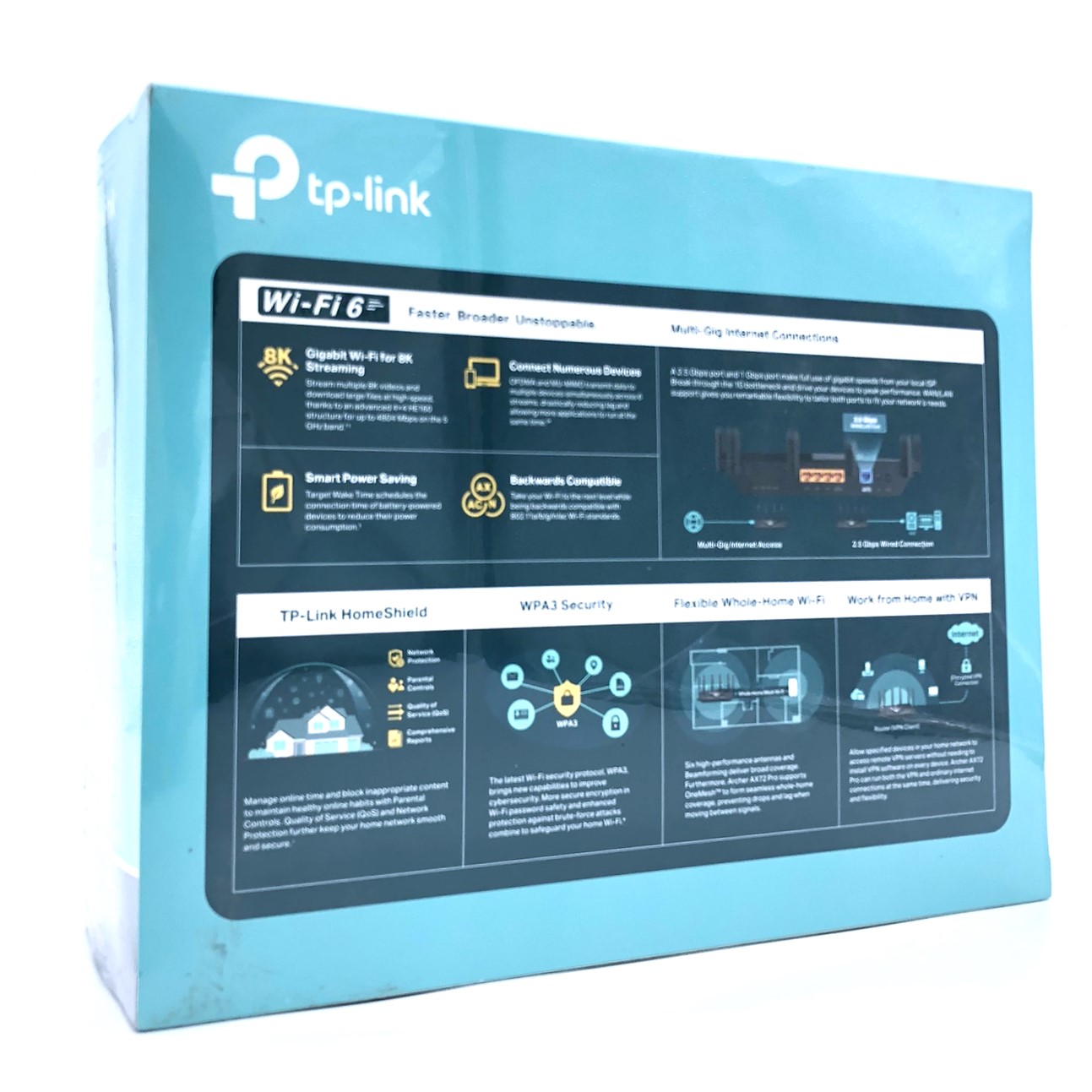 Egenskaber IGMP snooping, SPI, DFS-understøttet, forældrekontrol, Tilgangspunkt, drift, ACL support, QoS, virtuel server support, WPS, DHCP server, Samba support, FTP server, port fremsendelse, UPnP Media Server, nulstillingsknap, Apple Time Machine kompatibel, port triggering, dynamisk IP modus, IP-MAC binding, DHCP klient, 4T4R MIMO-teknologi, mærket VLAN, IGMP proxy, stråleformeteknologi, Static Link Aggregation, LED til/fra-knap, Airtime Fairness, 4x4 MU-MIMO-teknologi, Smart Roaming, DMZ-support, brotilstand, OpenVPN-klient, IPTV support, 8K HD video streaming, WPS-knap, OneMesh support, 160 MHz båndbreddesupport, auto-firmware-opdatering, TP-Link HomeShield, Wi-Fi til/fra-knap