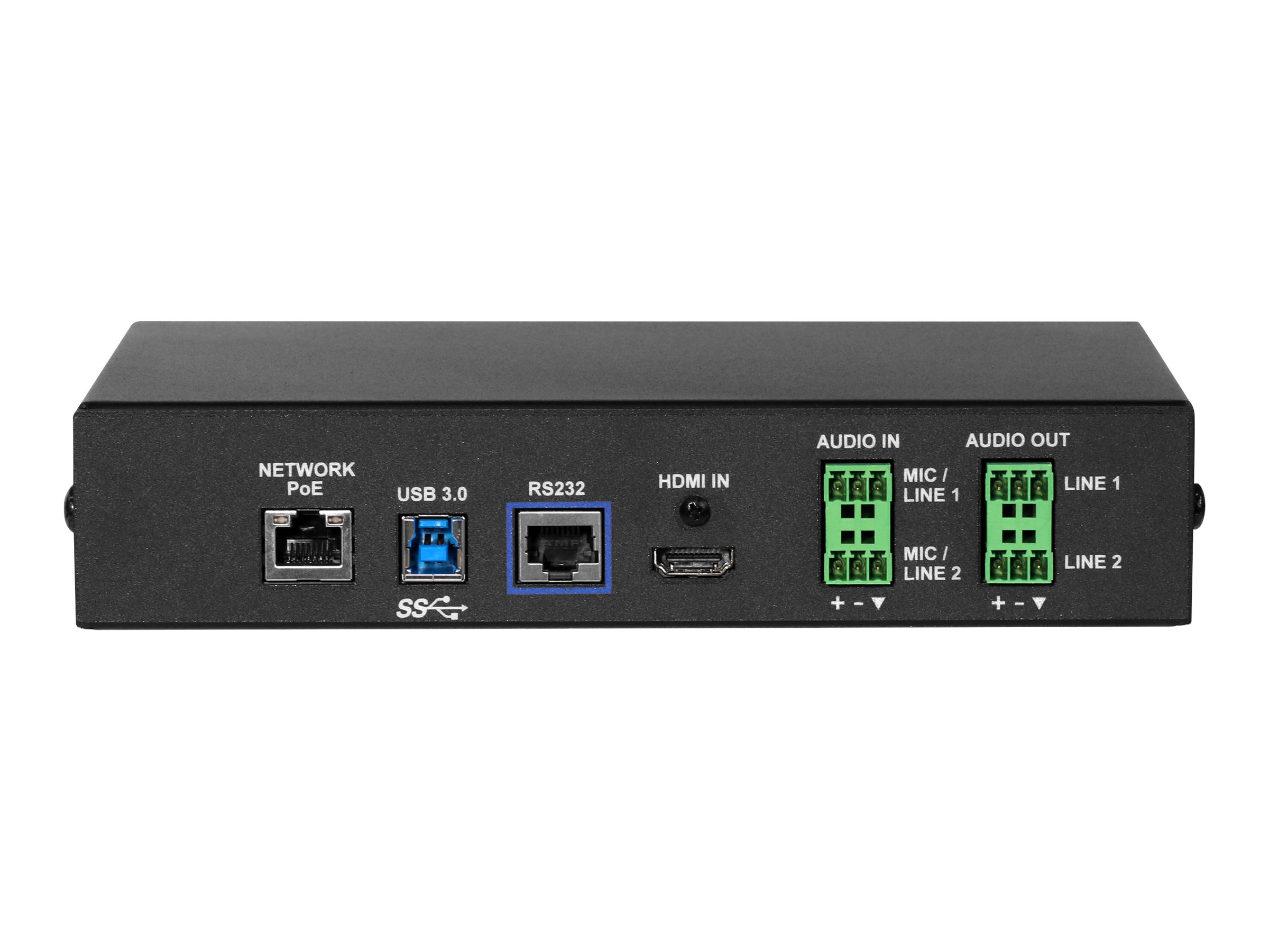 | Terminaler | (1) x netværk - RJ-45 - PoE | (1) x seriel - RJ-45 - RS-232 | (1) x HDMI-indgang - 19-pin HDMI, type A | (1) x USB 3.0 | (2) x audio linje-ind/ mikrofon - terminalblok - balanceret | (2) x lydudgang - terminalblok - balanceret |