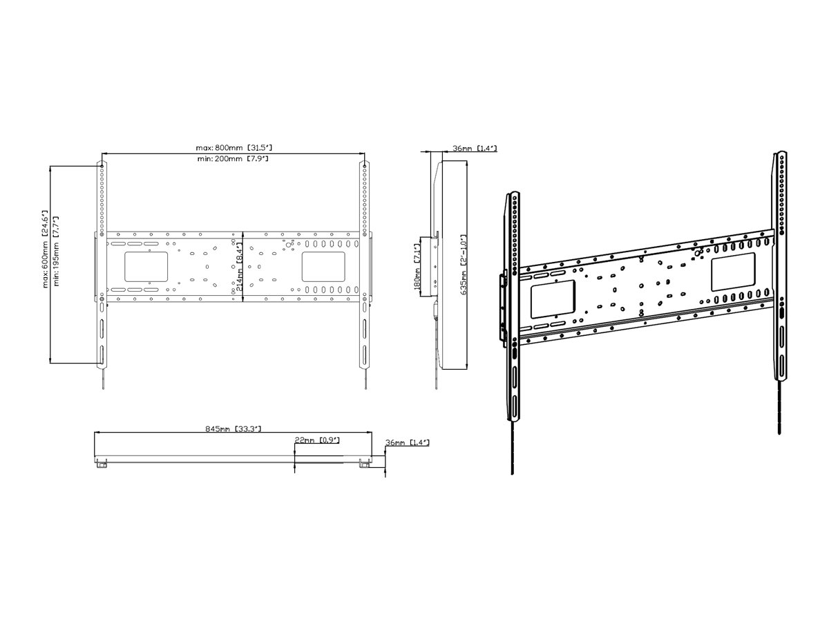 Det tynde design holder skærmen blot 36 mm / 1,4″ fra væggen. Det ser bedre ud, reducerer risikoen for at hænge fast, og eftersom belastningen er tæt på væggen, har monteringen en meget højere grad af sikker arbejdsbelastning.