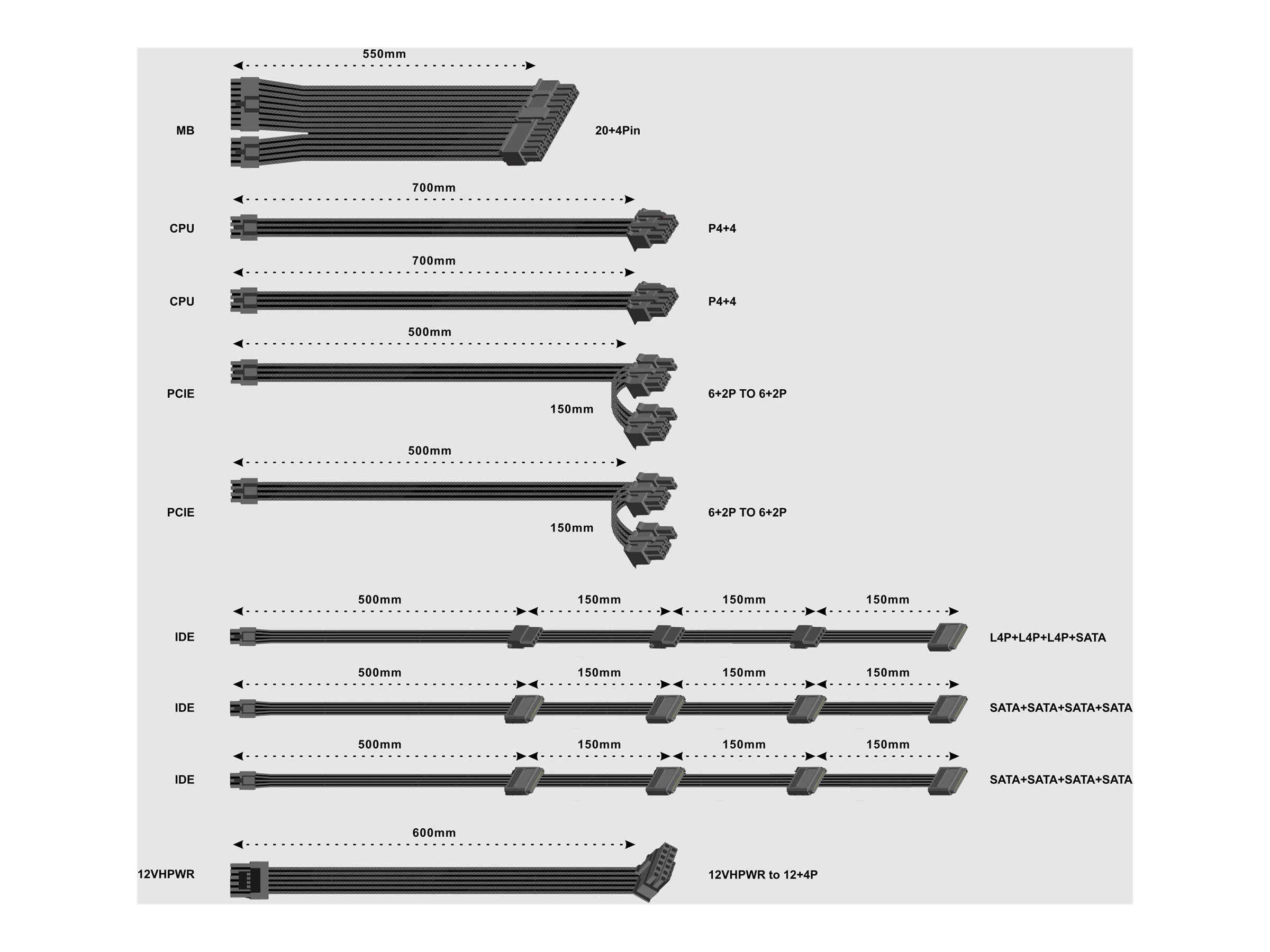 | Output-stikforbindelser | 1 x strøm 24 pin ATX<br>1 x strøm 8 pin EPS12 V<br>5 x 8 pin PCI Express-strøm<br>4 x 15 pin Serial ATA strøm |