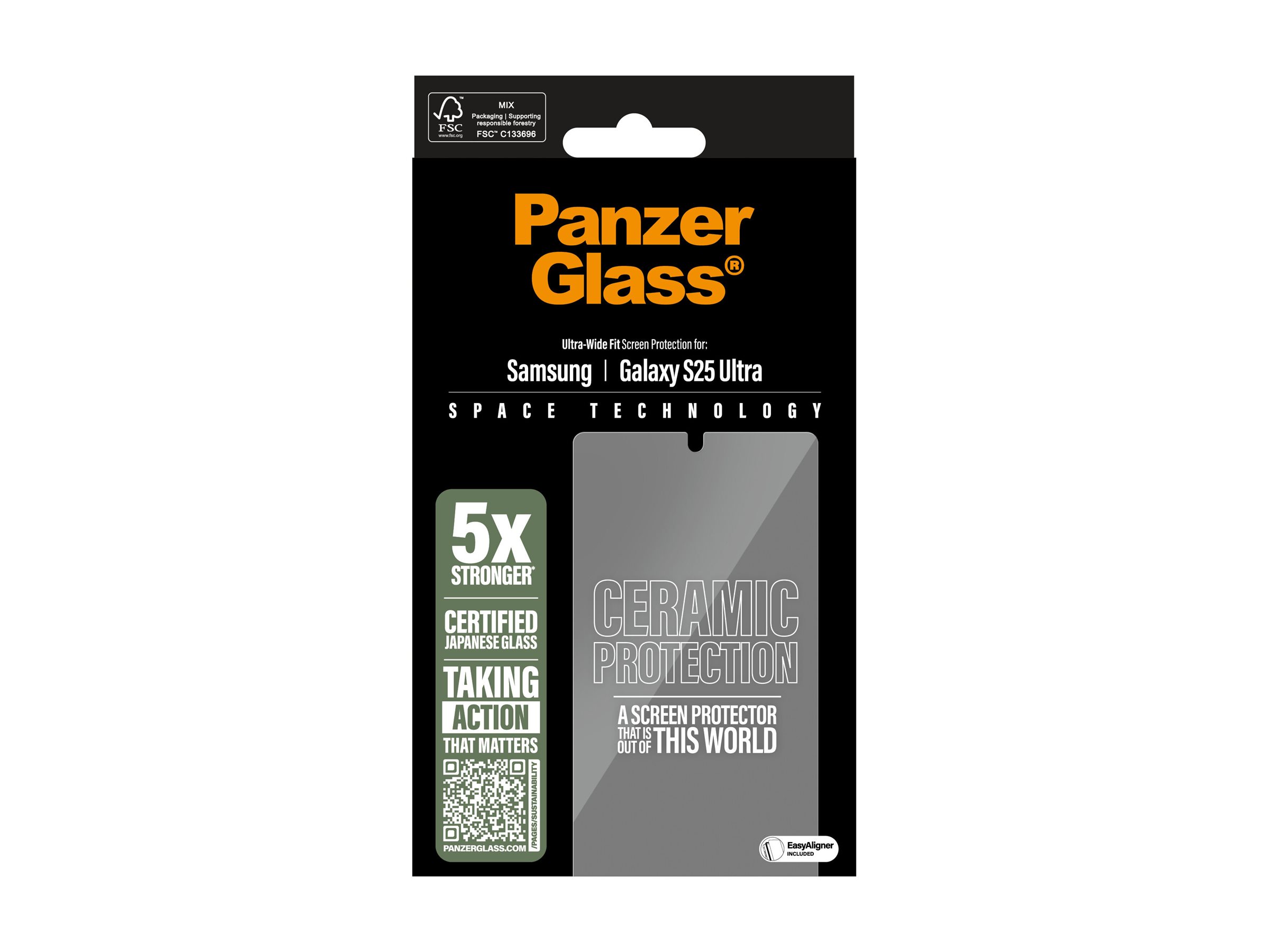 Med Ceramic Protection rækker PanzerGlass ud efter stjernerne og giver dig sin stærkeste skærmbeskytter til dato … ja, faktisk er Ceramic Protection hele 5 gange stærkere end vores stærkeste skærmbeskytter til dato! Det svarer til, at du kan lade en 320 g tung stålkugle falde fra 2,5 meter og ned på skærmbeskytteren, uden at den får så meget som en revne. Det er et tungtvejende argument, hvis du spørger os. Og så virker den perfekt med skærmens ultrasoniske fingeraftryksscanner, så du kan låse telefonen op med et enkelt tryk, akkurat som du er vant til.Skærmbeskytteren er lavet af certificeret keramisk glas fra japanske Ohara. Keramisk glas er ikke blot et af verdens mest ridsefaste materialer, men indeholder også ikke-synlige krystaller, der forhindrer revner i at sprede sig. Det giver keramisk glas en styrke, som ikke kan opnås med konventionelt skærmbeskytterglas. Og som om det ikke var nok, sikrer Oharas nano-krystalliseringsteknik en hidtil uset klarhed i glasset, som endda er udstyret med en smudsafvisende belægning, der reducerer fedtfingre og snavs. Den medfølgende EasyAligner gør installationen så legende let, at de fleste kan klare den i første forsøg. Og ellers er det bare at følge trin-for-trin-guiden eller scanne QR-koden til sådan-installerer-du-videoen. Når først skærmbeskyttelsen sidder på telefonen, er det slut med at frygte synet af din skærm med kurs mod asfalten. Det kommer muligvis aldrig til at ske, men hvis det gør, vil du fortryde, at du ikke klikkede "Tilføj til kurv". Skærmbeskytteren har størrelsen "Ultra-Wide Fit". Det betyder, at den dækker fronten af din telefon, samtidig med at den giver dig en fuldendt skærmoplevelse og efterlader lidt plads langs kanterne til et beskyttende cover fra PanzerGlass . Og vil du passe ekstra godt på din telefon, kan du nemt kombinere skærmbeskytteren og coveret med en PanzerGlass PicturePerfect eller HoopsTM kameralinsebeskytter. Dette produkt bliver leveret i en FSC -mærket æske, der kan genanvendes.