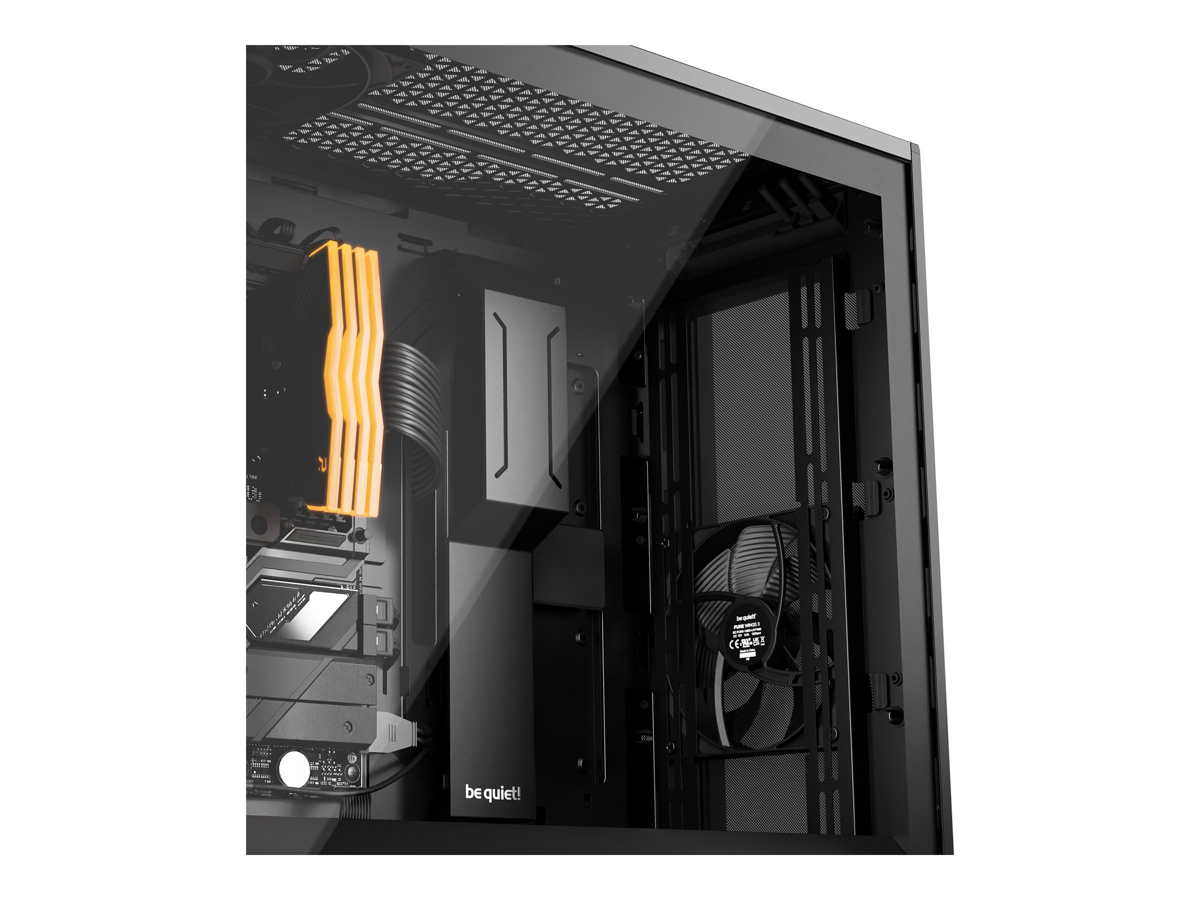 Be quiet! systemkabinettet har et luftstrømsoptimeret netfrontpanel, der sikrer, at dine komponenter forbliver kølige under tung belastning. Dette design fremmer effektivt luftindtag for at forbedre systemets ydeevne og levetid.
