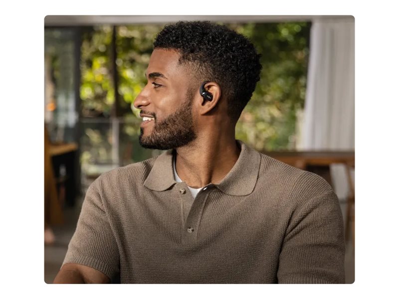 SHOKZ OpenFit 2 har et åbent øredesign, der øger komforten og samtidig giver mulighed for at høre omgivende lyde, hvilket gør den velegnet til udendørs brug.