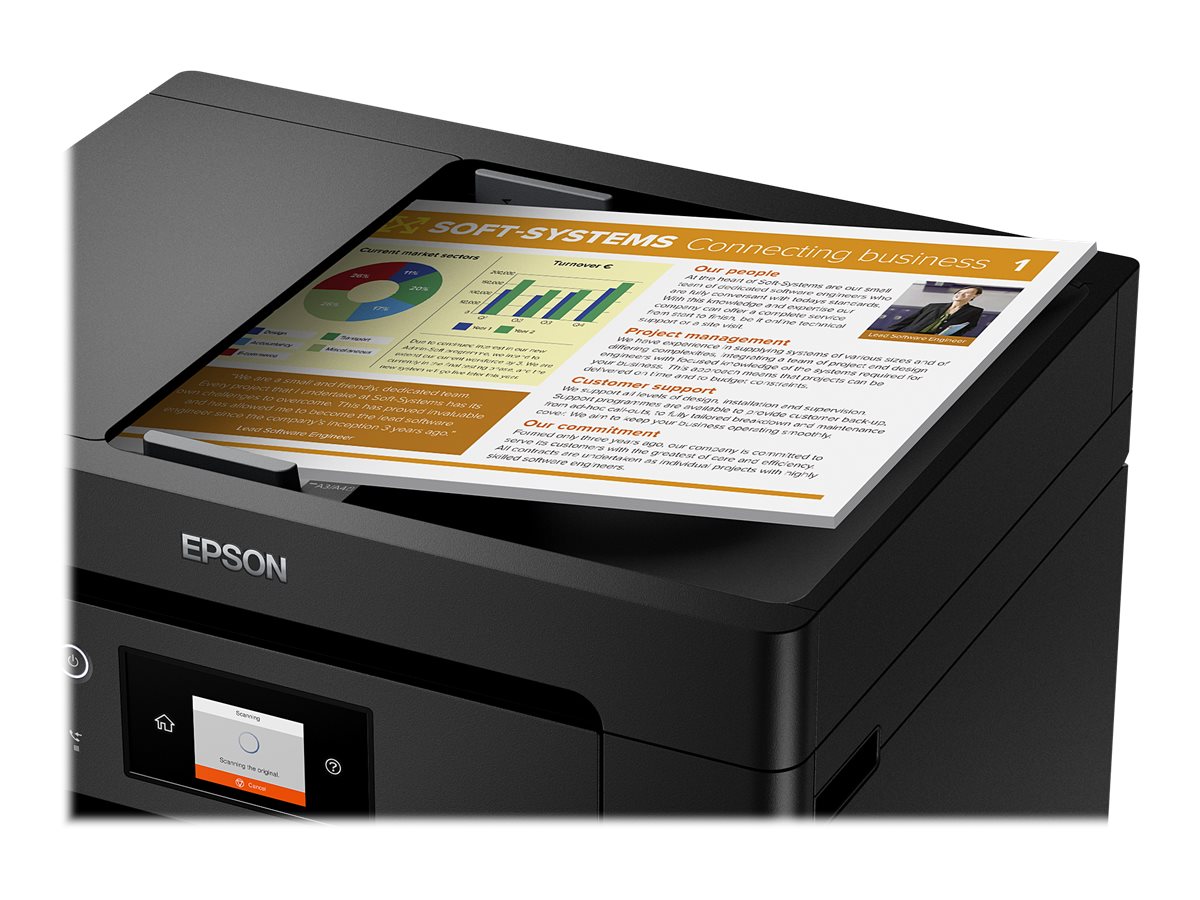 Udskriv overalt på kontoret med Wi-Fi-tilslutning eller brug Wi-Fi Direct til at udskrive fra trådløse enheder uden et Wi-Fi-netværk. Epsons gratis apps og løsninger til mobil udskrivning giver yderligere fleksibilitet. Email Print gør det muligt at sende dokumenter til udskrivning fra stort set overalt i verden. Med Scan-to-Cloud kan du desuden nyde godt af fordelene ved samarbejde.