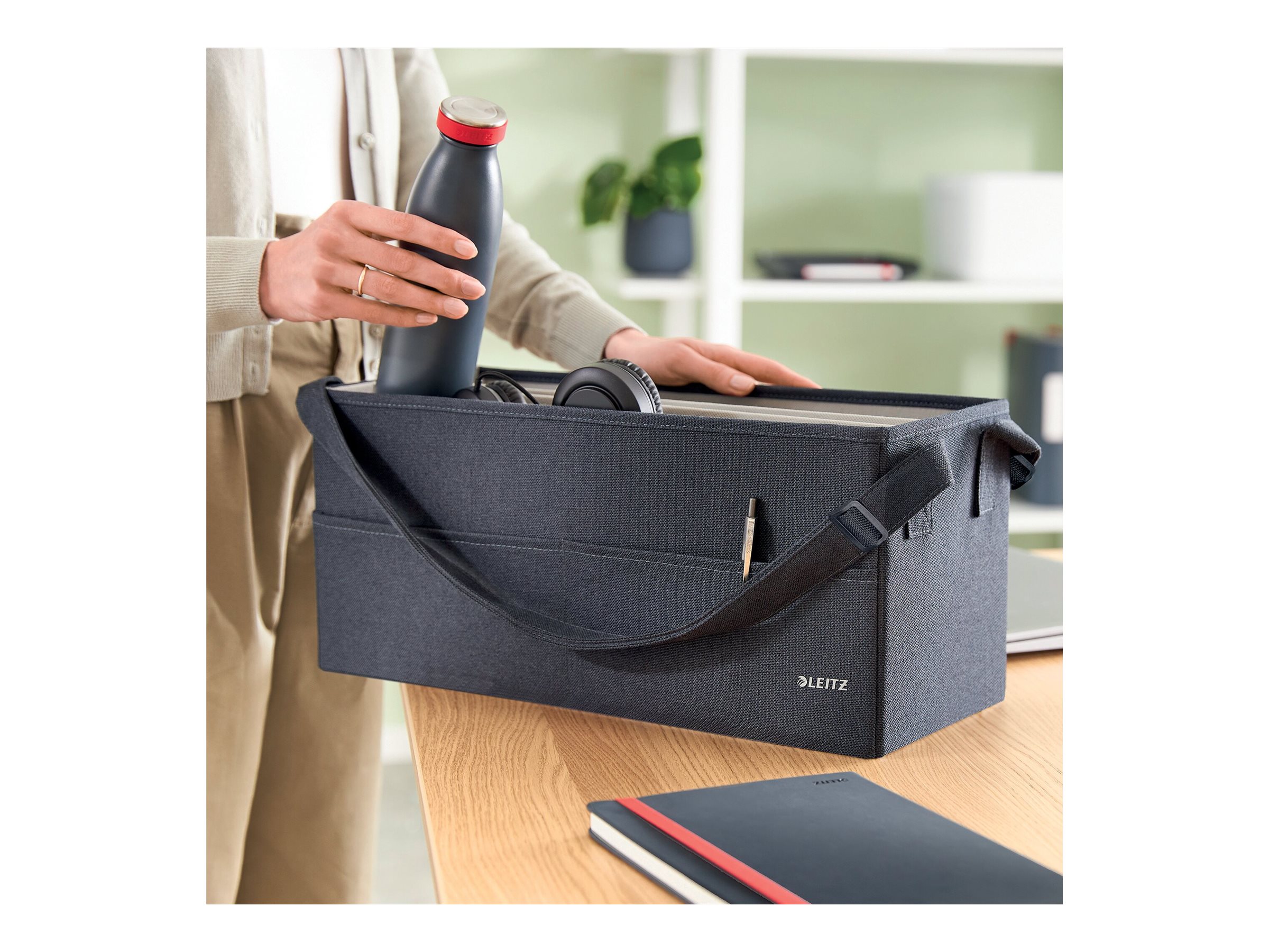 Føl dig hjemme, uanset hvor din dag fører dig hen, med opbevaringsserien i stof fra Leitz. Med sit minimalistiske design og indbydende matgrå fløjlsfinish kan du være stilfuld, mens du forbliver organiseret på kontoret, hjemme, arbejder hybrid eller hvor som helst derimellem. Leitz hot desking-arbejdstaske i stof har tre separate rum, der giver dig mulighed for at opbevare og bære alt, hvad du har brug for til den kommende dag. Denne moderne og praktiske opbevaringstaske har plads nok til at rumme en bærbar computer på op til 18'', et tastatur i fuld størrelse, en mus, et opladerkabel, et headset, en notesbog og en vandflaske. Den passer i skabe eller reoler med minimumsmål på 480 x 210 mm og en højde på 220 mm. Også velegnet som lærertaske. Fremstillet af blødt materiale forstærket med recirkuleret pap for styrke og holdbarhed. Samlet 57% recirkuleret materiale. Når den ikke er i brug, er tasken fuldt sammenfoldelig, så den nemt kan gemmes væk. Navneskiltet, der følger med tasken, giver dig mulighed for nemt at identificere den i fælles rum. Denne hot desking-arbejdstaske med bærehåndtag i justerbar længde er den perfekte tilføjelse til dit hjem, kontor eller skole for at sikre, at du forbliver afslappet og produktiv hele dagen.