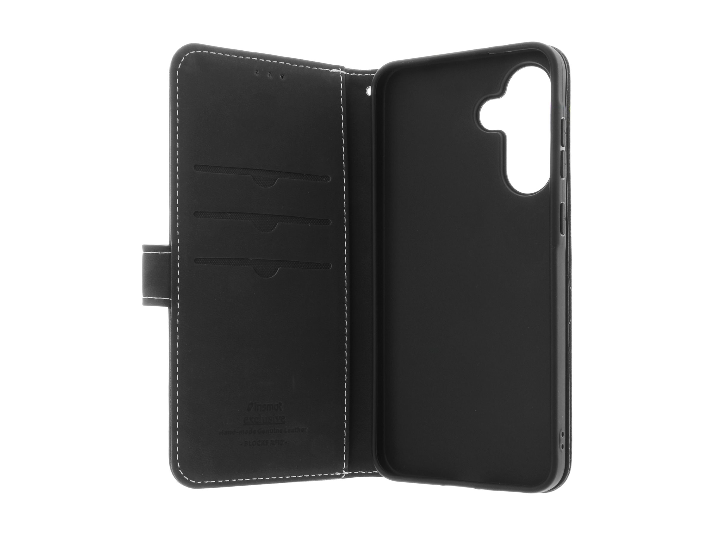 Insmat Exclusive - Flipomslag til mobiltelefon - ægte læder, pap+papir, termoplastisk polyuretan (TPU), bomuldssyninger - sort - for Samsung Galaxy A36, A56