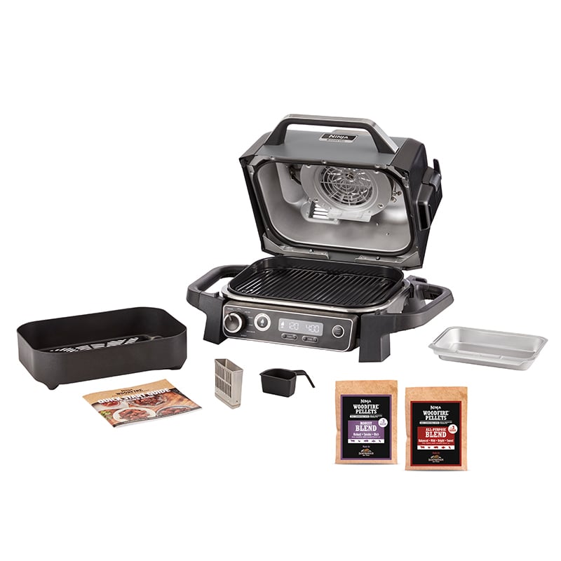 | Inkluderet | 1x grillplade, 1x airfryer-kurv, 1x aftagelig røgboks til træpiller, 1x fedtbakke, 1x pille-skovl, Ninja Woodfire-piller (Robust+ All-Purpose prøveposer) |