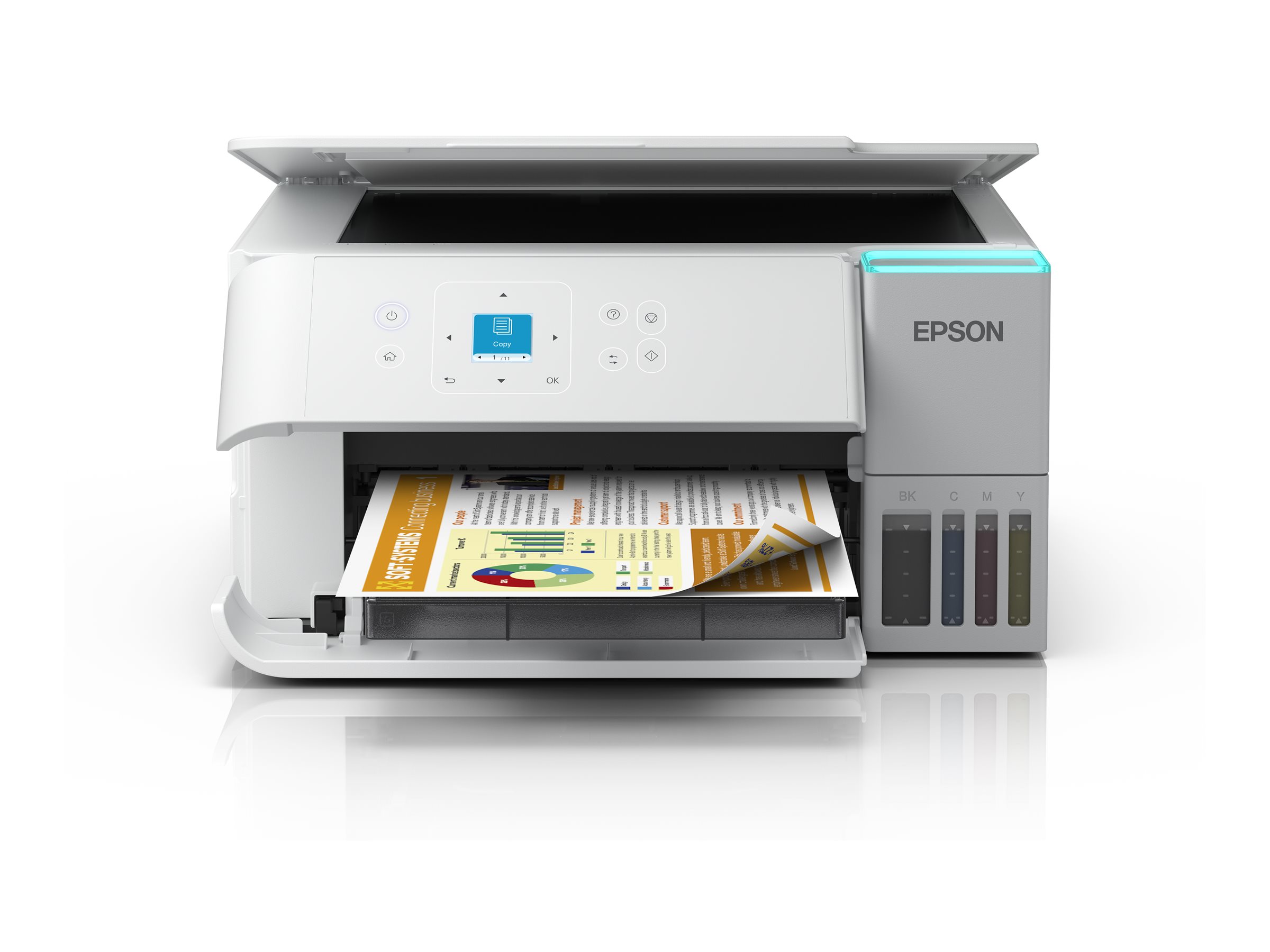 EcoTank giver problemfri udskrivning til hjemmet. Blækbeholderne med ultrahøj kapacitet giver mulighed for genopfyldninger uden spild, og nøglelåsflaskerne er designet, så kun de korrekte farver kan isættes. Frontdisplayet gør det nemt at se, hvornår det er tid til en genopfyldning.