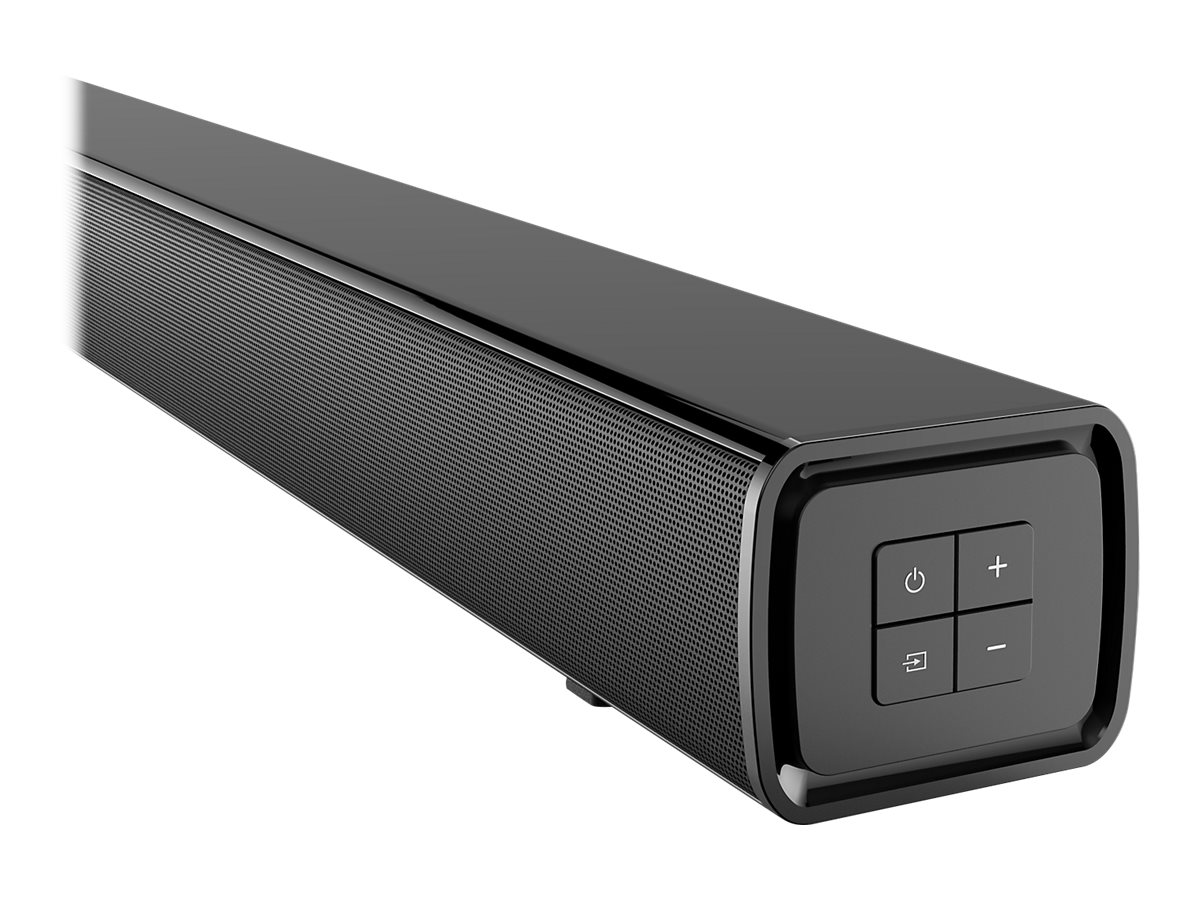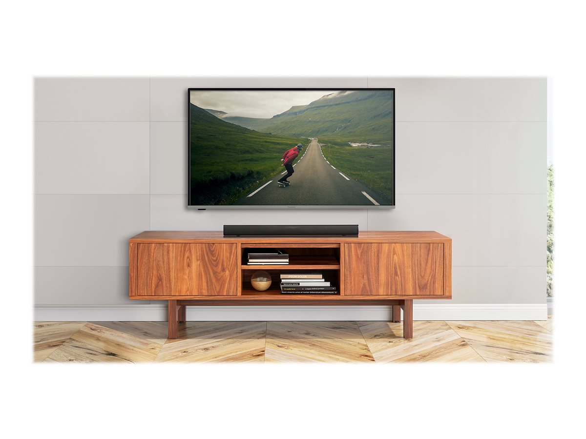 Med sine slanke linjer, stilfuld blank sort finish og metalnetgitter supplerer HTB100 både dit tv's udseende såvel som dets lyd. Da den er placeret diskret under tv'et, vil den ikke distrahere dig fra handlingen på skærmen.