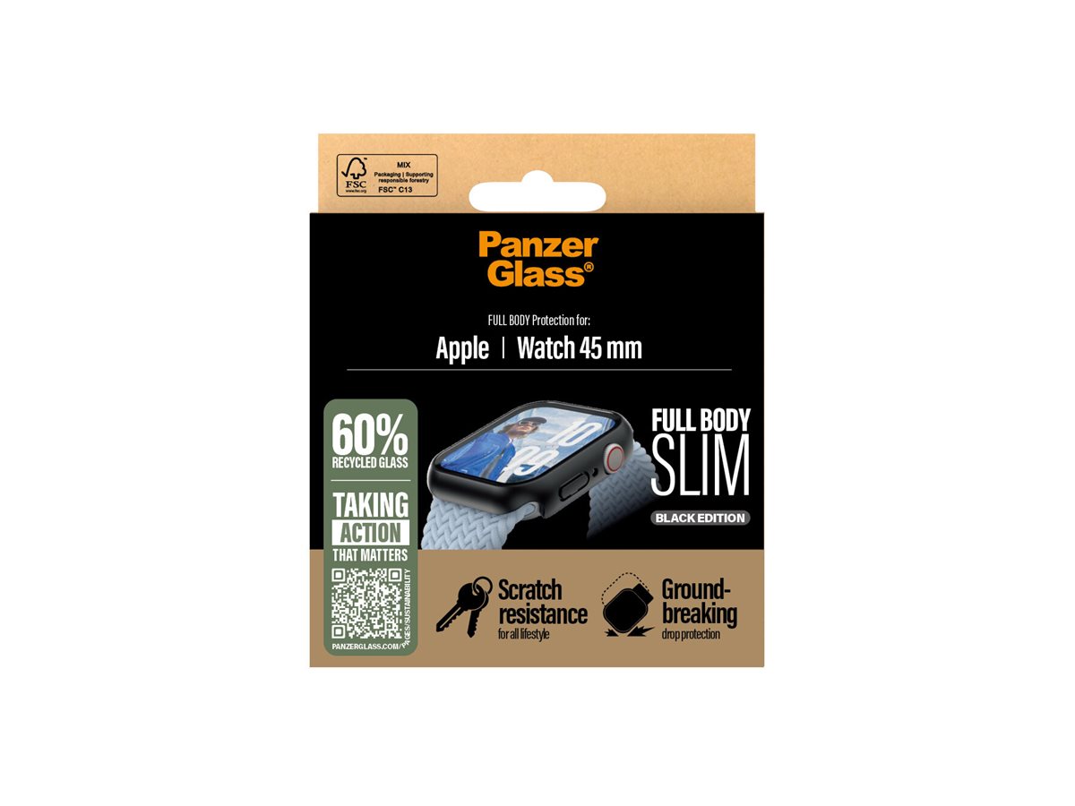Coveret i fuld størrelse med sort ramme dækker hele fronten og siderne på dit ur. Det slanke design giver beskyttelse hele vejen rundt uden at gøre uret større, og du har stadig let adgang til alle knapper. Vi beskytter ikke kun dit ur- vi beskytter også planeten. I 2024 reducerede vi mængden af papir i vores emballager med 66 %*, ligesom vi nu leverer dette produkt i en genanvendelig FSC-mærket æske. *Gennemsnitlig reduktion fra 2022 til 2024 beregnet ved at sammenligne udvalgte PanzerGlass kerneprodukter.