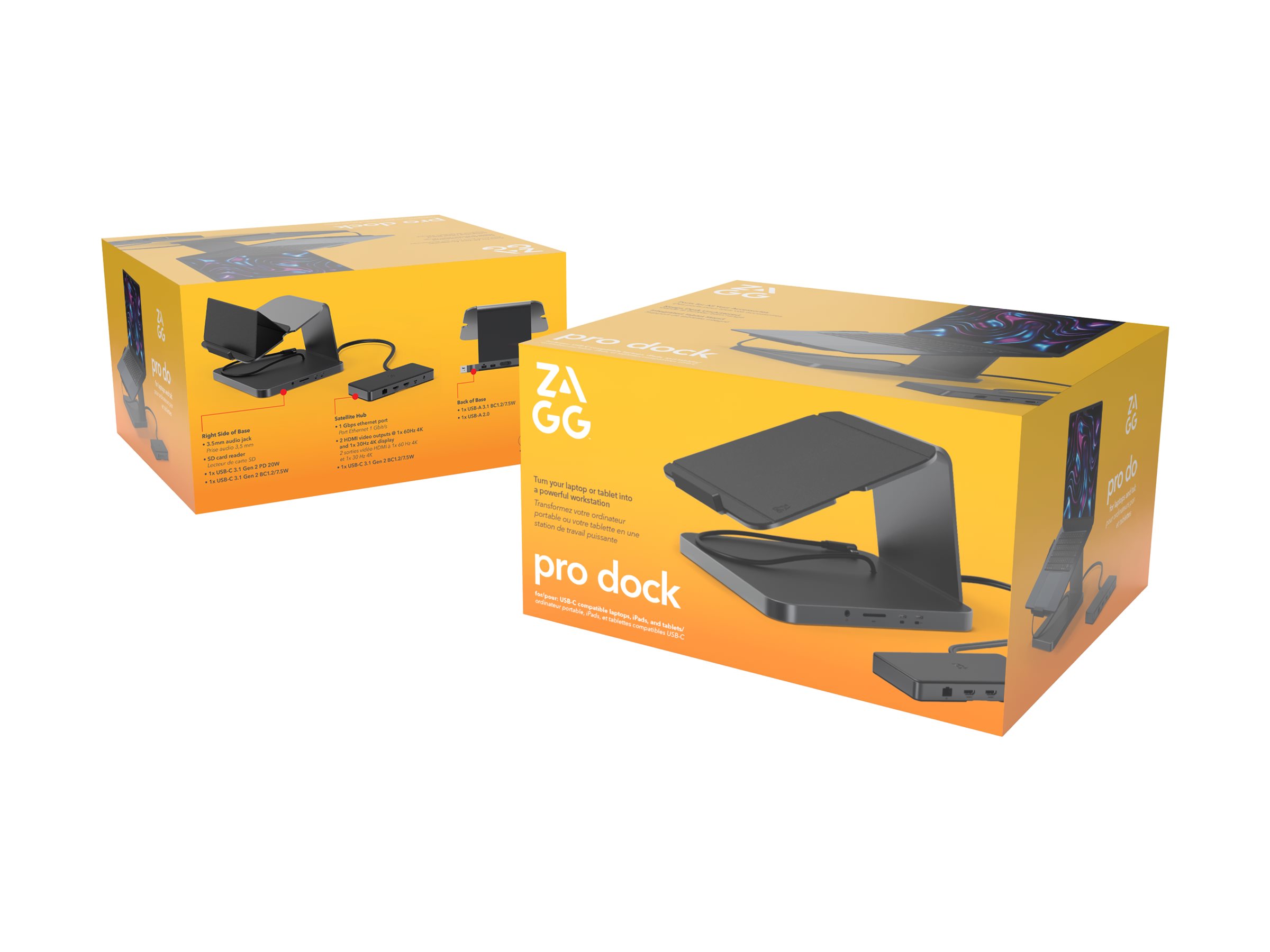 ZAGG Pro er en alsidig dockingstation, der er designet til at øge produktiviteten og tilslutningsmulighederne. Med et integreret USB-C-kabel giver denne enhed problemfri adgang til flere grænseflader, herunder USB-C, HDMI, lyd og Ethernet. Med understøttelse af dataoverførsel og 4K-videoopløsning ved 60 Hz giver Pro brugerne mulighed for at tilslutte forskellige enheder og nyde lyd og video i høj kvalitet.
