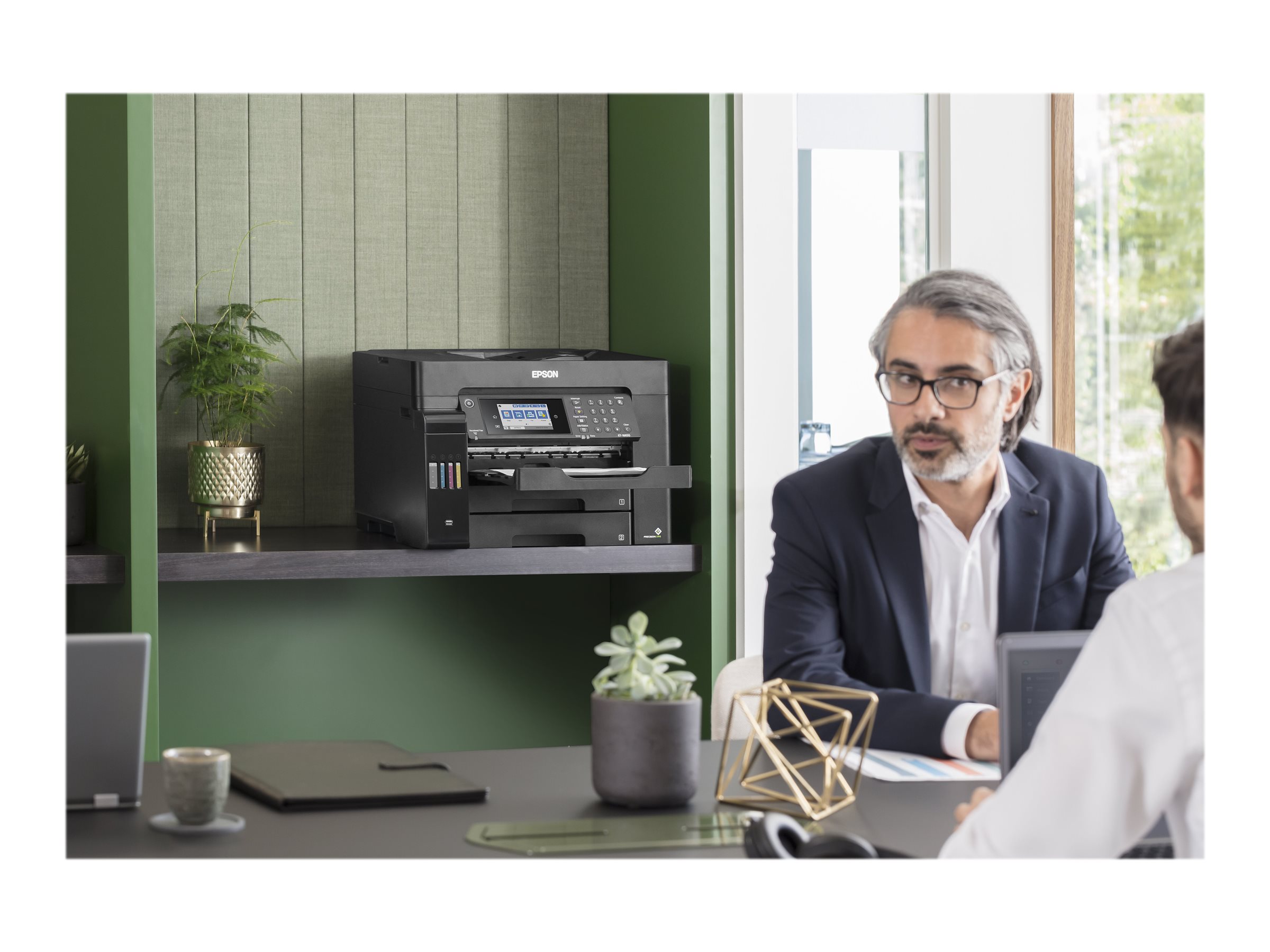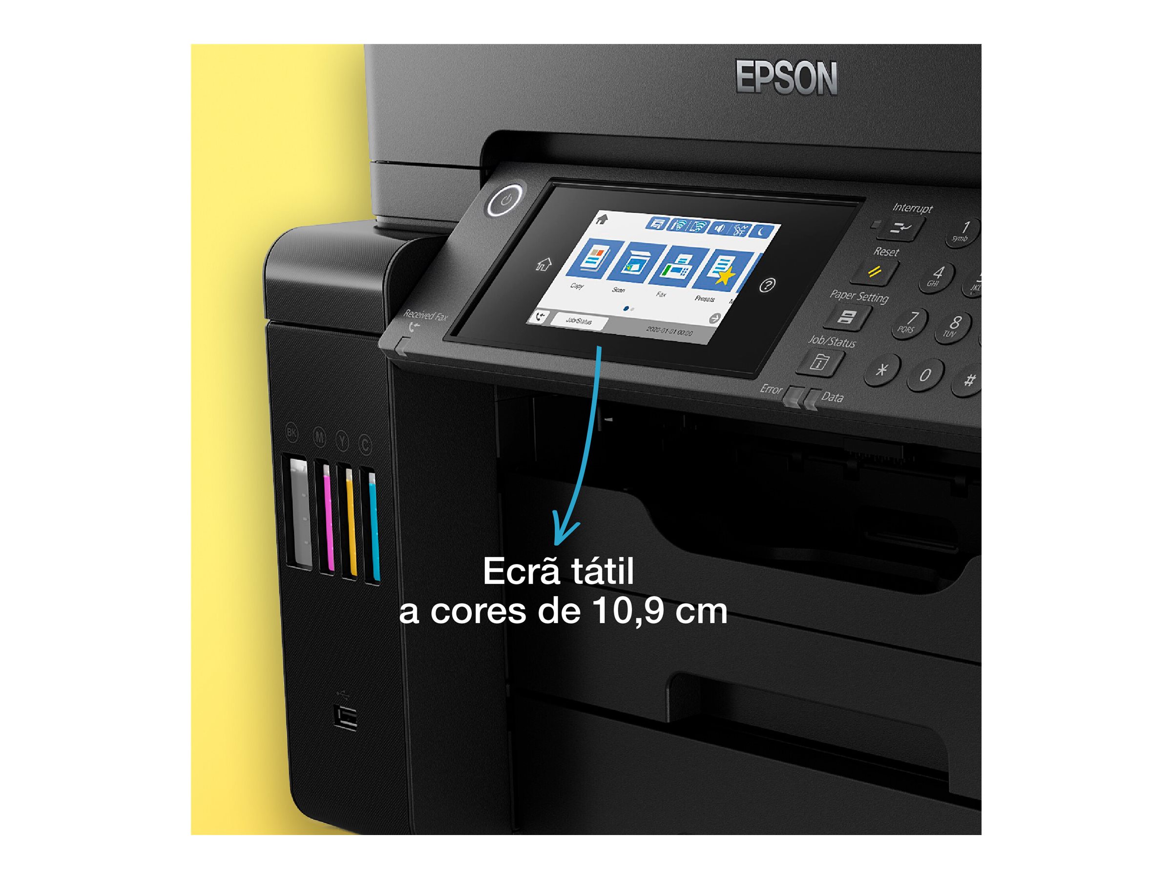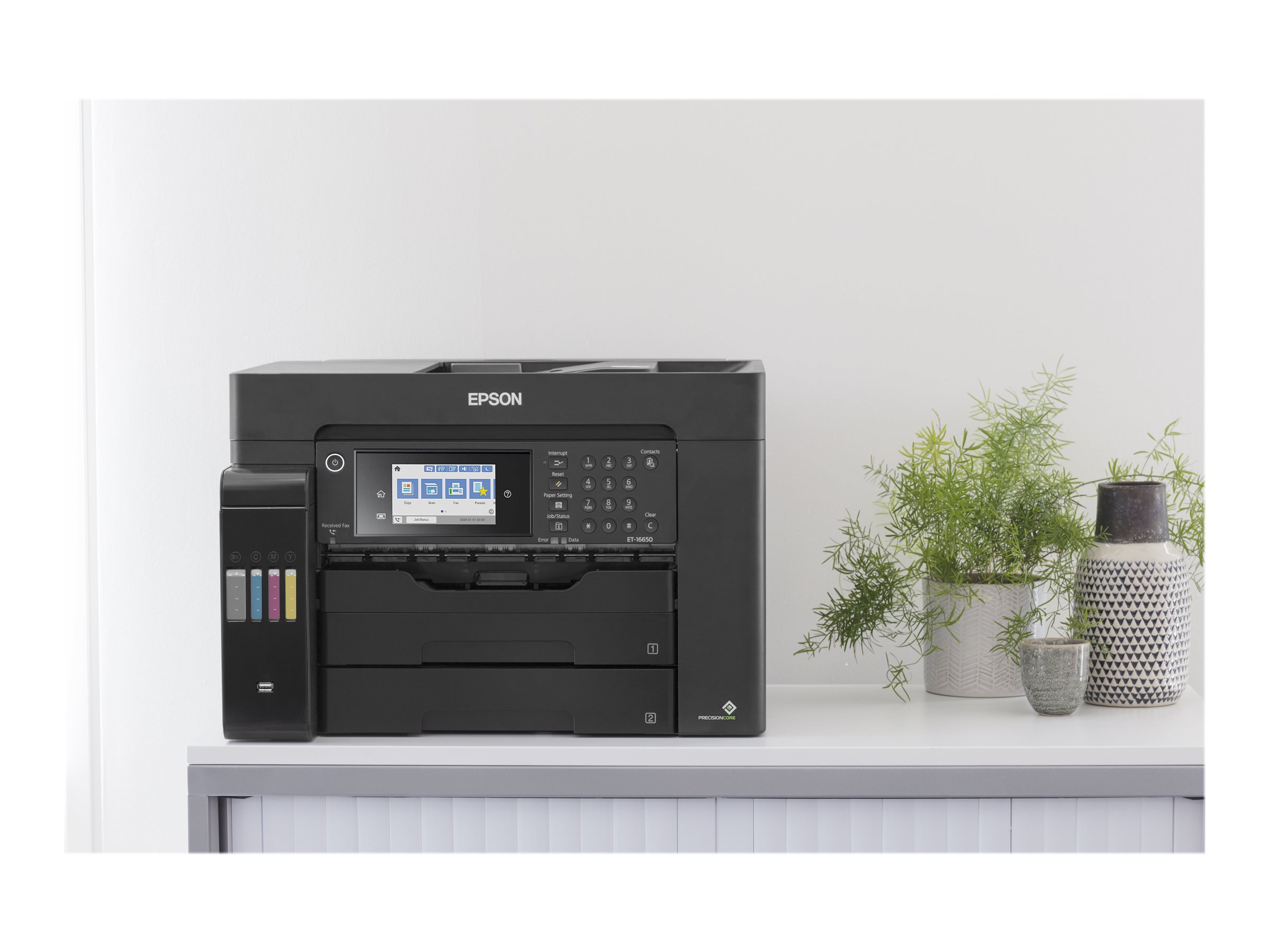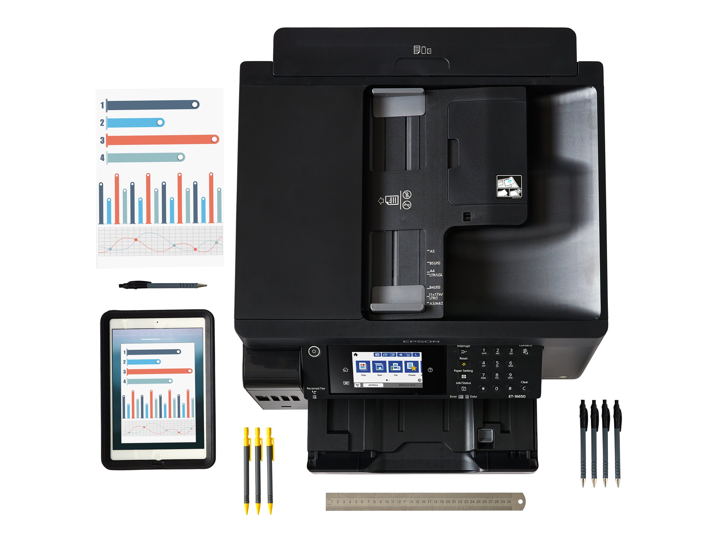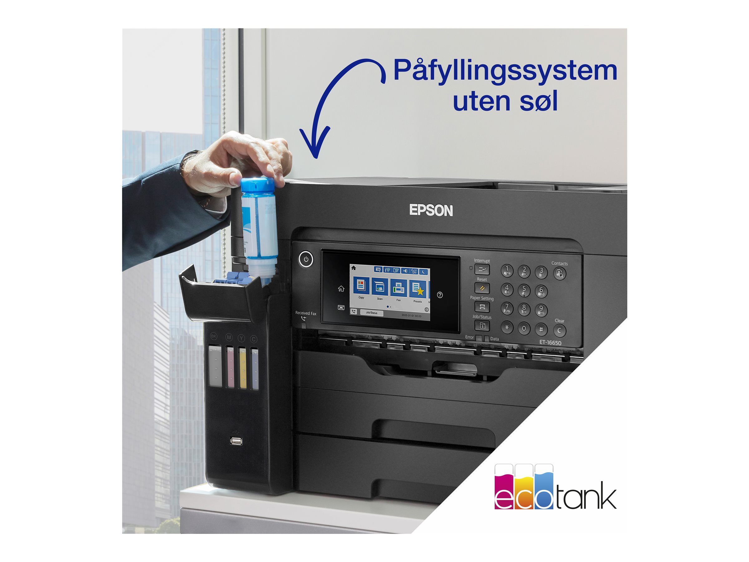 ET-16650 er udviklet til A3-opgaver med A3+-udskrivning, -scanning og -kopiering. Det er let at finde rundt i de mange funktioner med LCD-berøringsskærmen på 10,9 cm og de hårde taster.