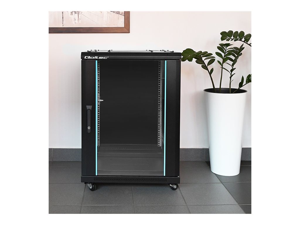 | Produktbeskrivelse | Qoltec - rack - 600 x 855 x 600, perforerede døre, fødder + styrehjul, ståletui, lås - 15U |