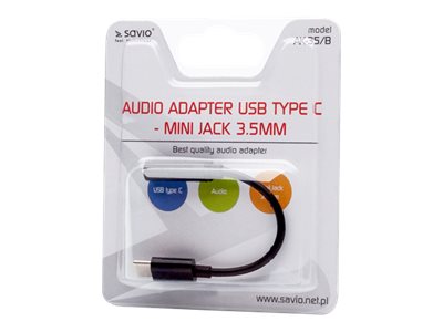 SAVIO AK-35/B - USB-C til hovedtelefon jackstikadapter - USB-C han til mini-phone stereo 3.5 mm hun - 12 cm - sort