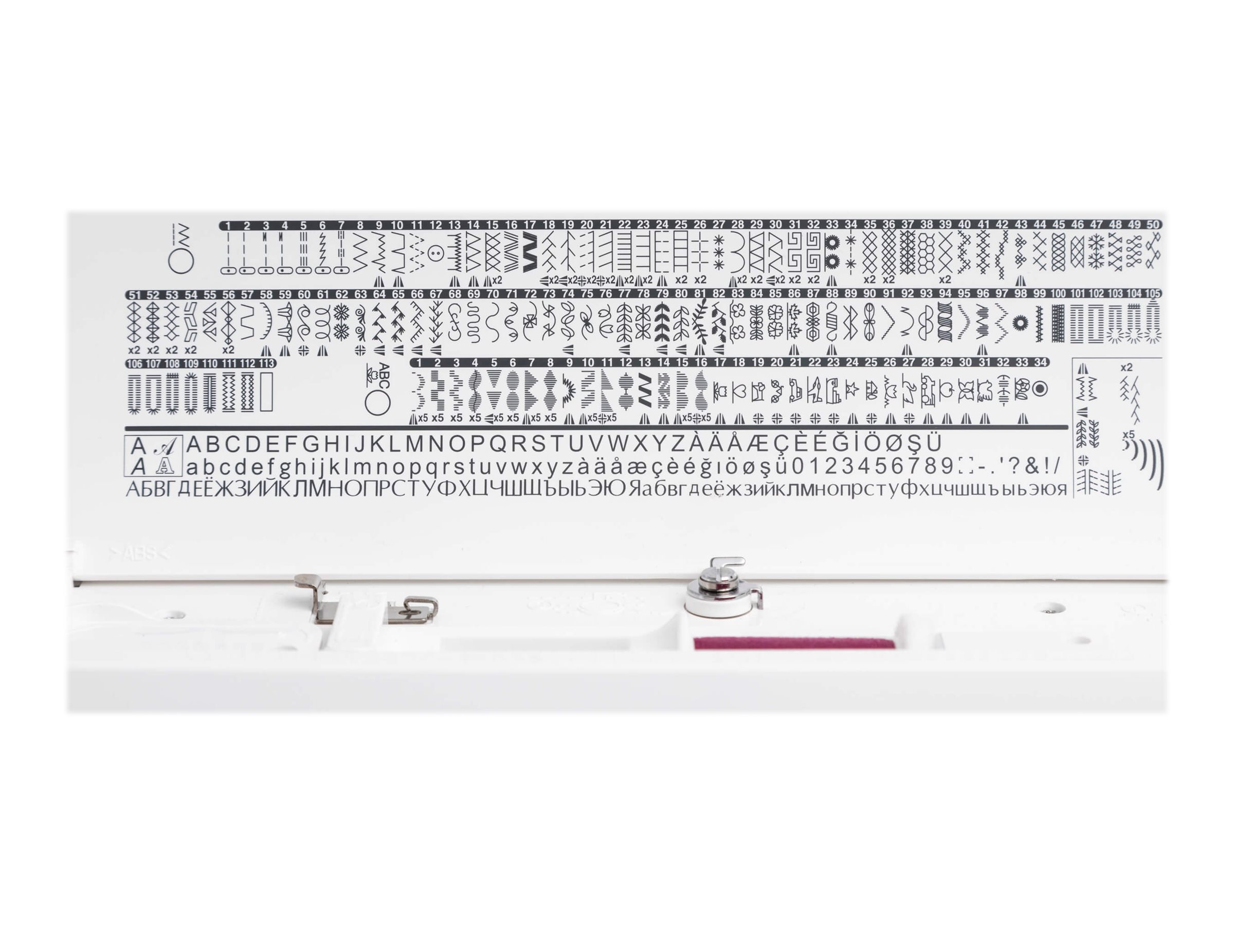 | Funktioner | Hastighedskontrol, automatisk afbinding, elektronisk dobbeltnålekontrol, automatisk spænding, spejlbilledefunktion, sømlængdevælger, pressefodsensor, programmerbar nål op/ned, trådskærer, syningshukommelsesfunktion, stingbreddevælger, indbyggede 5 alfabeter |