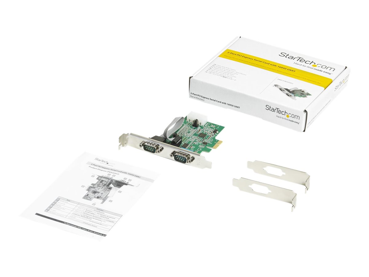 | Produktbeskrivelse | Startech 2-port PCI Express RS232 Serial Adapter Card, PCIe RS232 Serial Host Controller Card, PCIe to Dual Serial DB9 COM Port Card, 16950 UART, Expansion Card, Windows, macOS, Linux - Full/Low-Profile (PEX2S953) - seriel adapter - PCI Express x1 - RS-232 x 2 |
