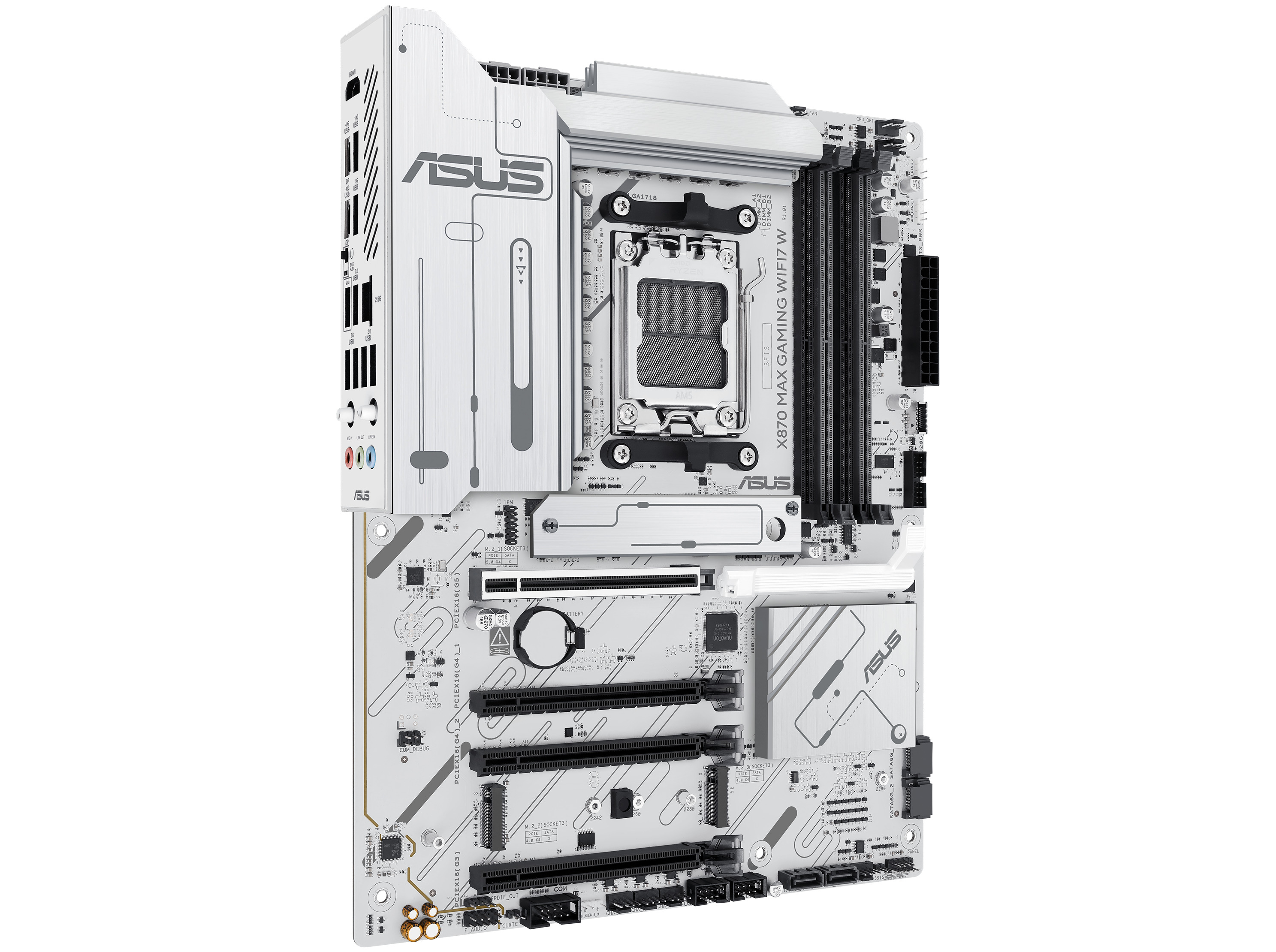 ASUS X870 MAX GAMING WIFI7 WHITE. Processorproducent: AMD, Processor sokkel: Sokkel AM5, Kompatibel processor serie: AMD Ryzen 7000 Series, AMD Ryzen 8000 Series, AMD Ryzen 9000 Series. Understøttede hukommelsestyper: DDR5-SDRAM, Maksimal intern hukommelse: 256 GB, Hukommelses slots type: DIMM. Understøttede lagerdrev brugerflader: M.2, SATA III, Understøttet datalagringsdrev typer: HDD & SSD, RAID-niveauer: 0, 1, 5, 10. USB-stik type: USB Type-A, USB Type-C. Ethernet-grænsefladetype: 2.5 Gigabit Ethernet, Bedste Wi-Fi standard: Wi-Fi 7 (802.11be)