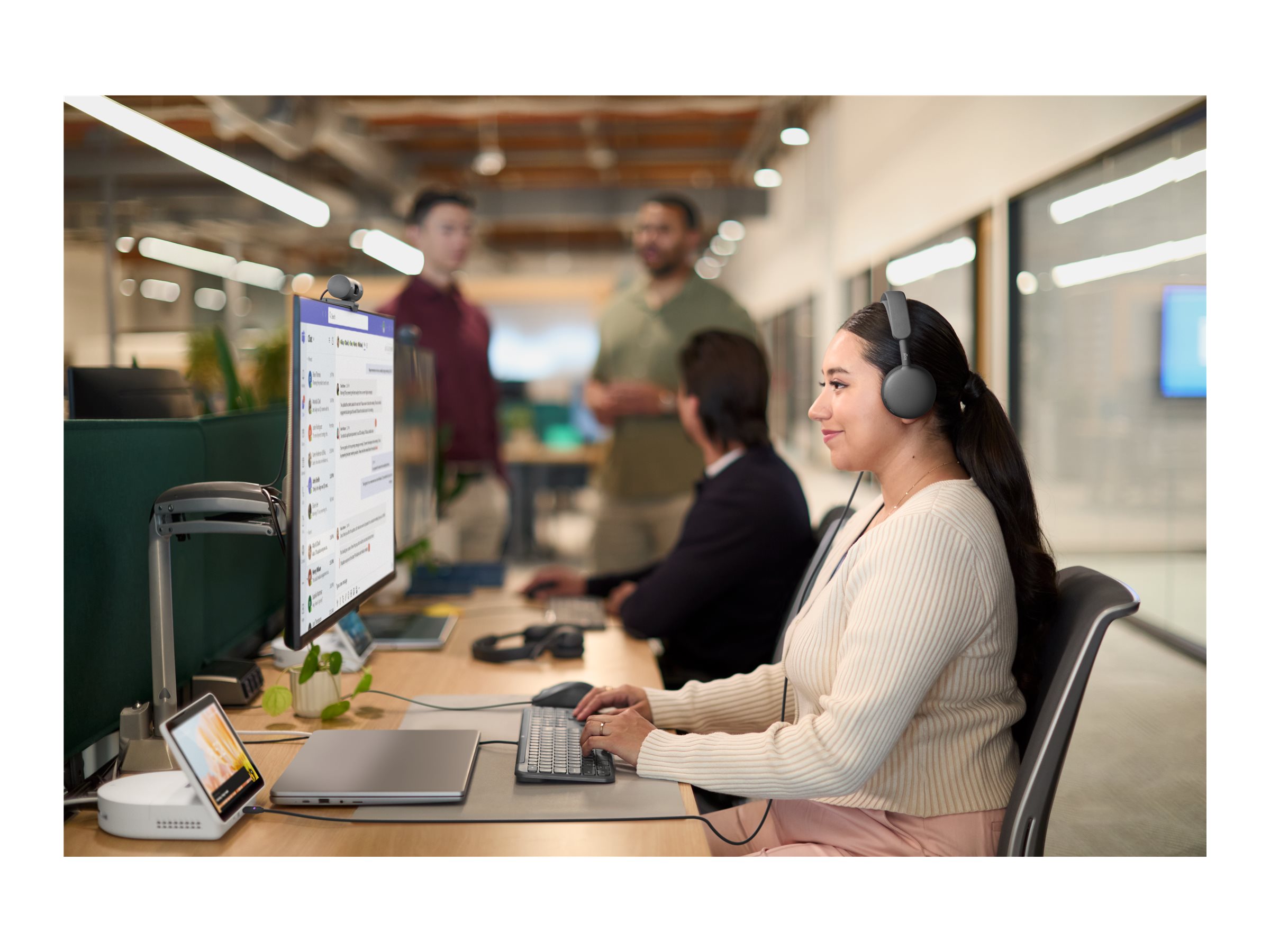 Din stemme i centrum. To støjreducerende mikrofoner med AI-baserede algoritmer dæmper baggrundslyde – snak og tastelyde – så du går krystalklart igennem. Som en ekstra finesse er den certificeret til at opfylde Microsoft Teams Premium Microphone til Open Office-krav
