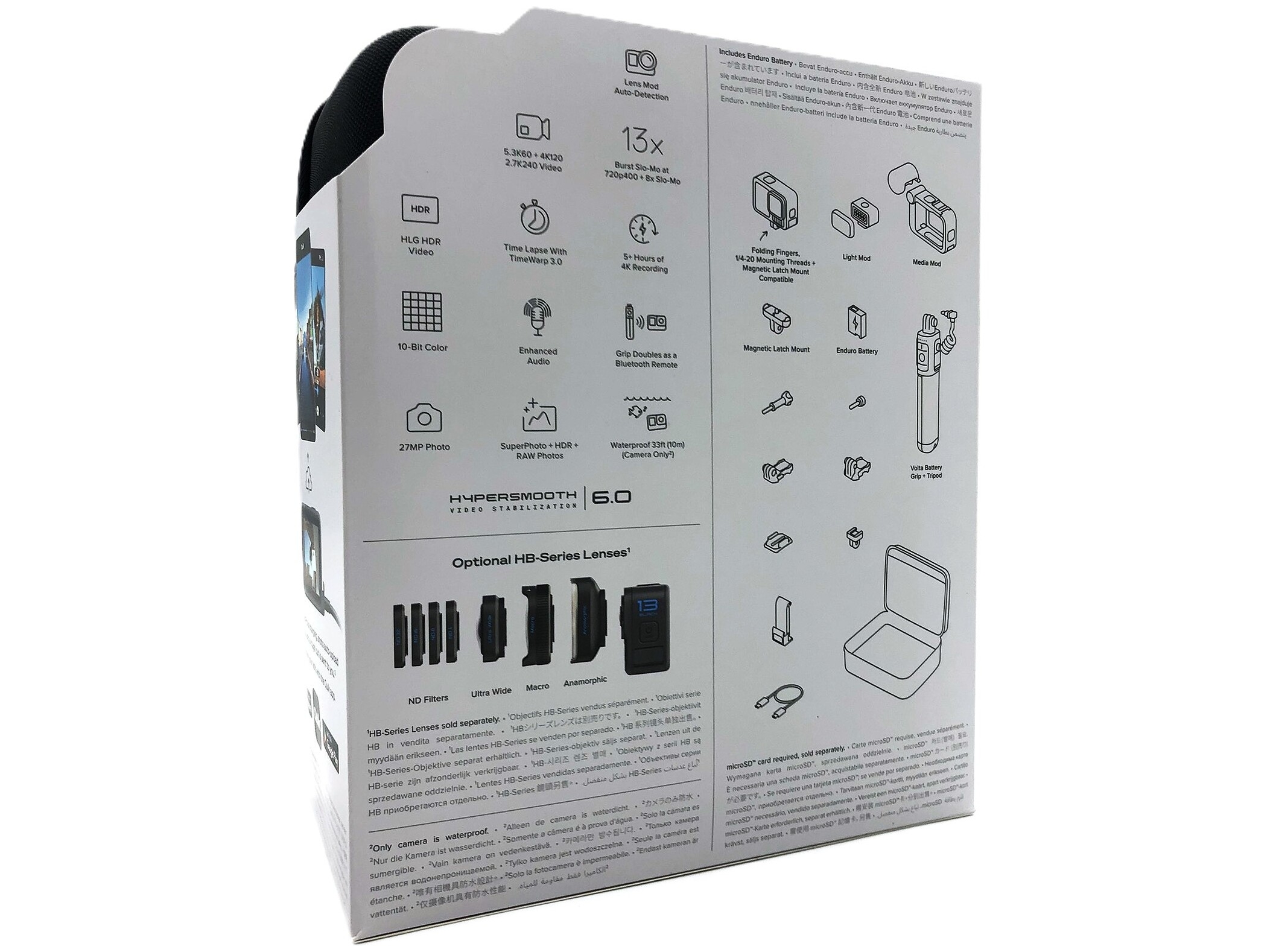 | Ekstra egenskaber | HDR billedforbedringsteknologi, horisontudjævning, horisontlås, HindSight, duration capture, skema optagelse i power-off tilstand, tidskode, indbygget højttaler, Dobbelt LCD skærm, autoboost, stemmestyring, PC webcam-funktion, Interval-optagelsesmodus, Protune support, burst af flere billeder, 3 indbyggede mikrofoner, denoise |