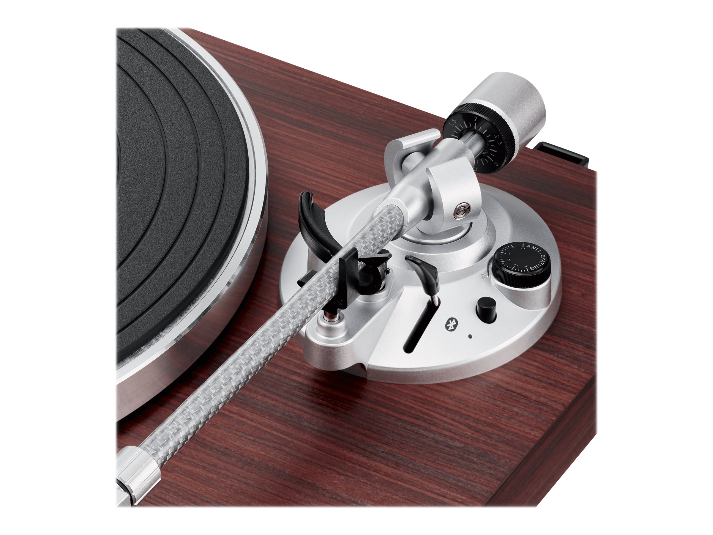 | Egenskaber | Løs støvdække med hængsler, indbygget RIAA-equalizer, tonearm af kulstof, fono/linje output-kontakt |